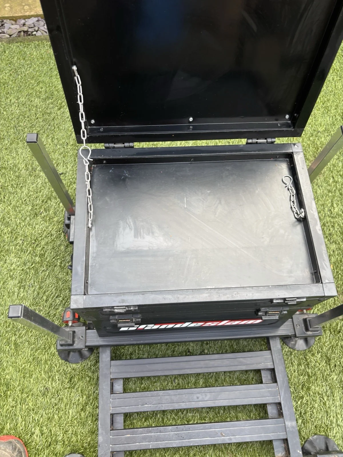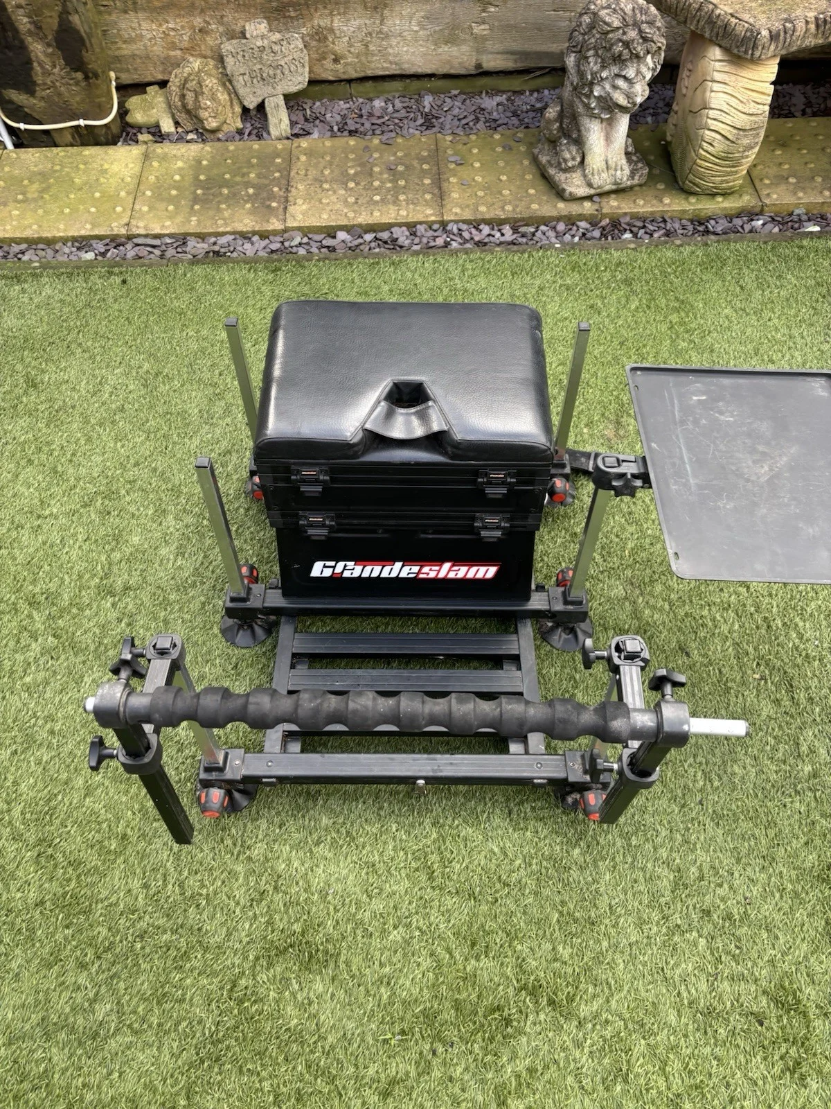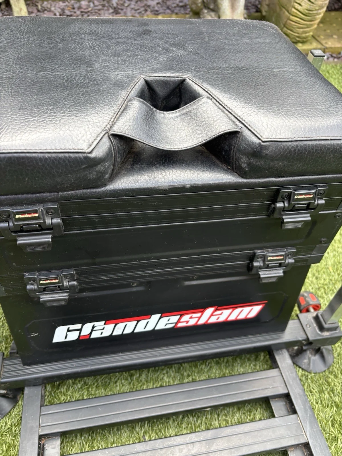Grandeslam G2 match fishing pole seat box in excellent condition comes with two slide out side trays slide out foot plate and deep storage and another tray under the seat spray bar and pole end holder in the seat and padded shoulder strap