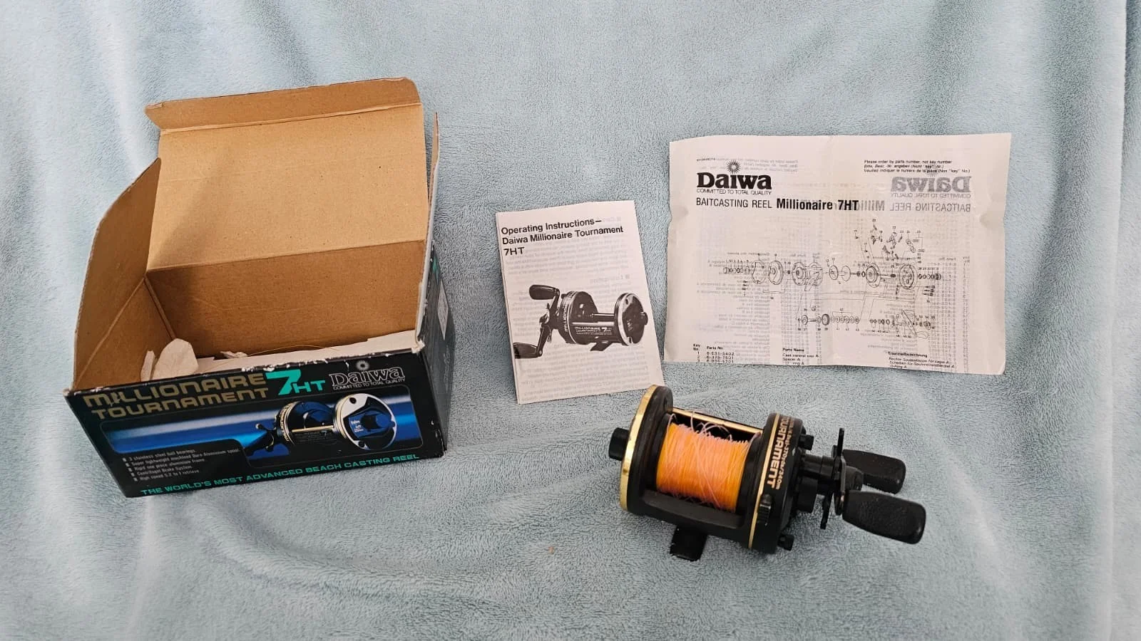 That is a classic "Blue Label" Daiwa Millionaire Tournament 7HT. This reel is highly regarded among sea anglers and tournament casters for its legendary distance and simplicity.Here is a ready-to-use eBay listing designed to attract serious buyers.DescriptionHeadline: The Original King of Distance – Daiwa 7HT Millionaire TournamentUp for sale is the iconic Daiwa Millionaire Tournament 7HT beach casting reel. Known as the "Blue Label," this was the first open-frame multiplier designed specifically for the UK beach fishing and tournament casting scene. It remains one of the most sought-after reels for its incredible "straight out of the box" casting performance.Product Features:Rigid One-Piece Frame: Machined from Duraluminium for maximum strength and zero flex.Super Lightweight Spool: High-grade aluminium spool for low start-up inertia and massive distance.Braking System: Centrifugal brake system (includes blocks) for controlled, birdnest-free casting.Smooth Retrieve: 5.2:1 high-speed gear ratio with 3 stainless steel ball bearings.Classic Design: The original blue finish and star drag system.Condition:Box: Included (shows some shelf wear consistent with age, as seen in photos).Reel: Excellent used condition with minimal marksSpecifications:Line Capacity: 340m / 14lbWeight: approx. 312gBearings: 3 Stainless Steel Ball Bearings