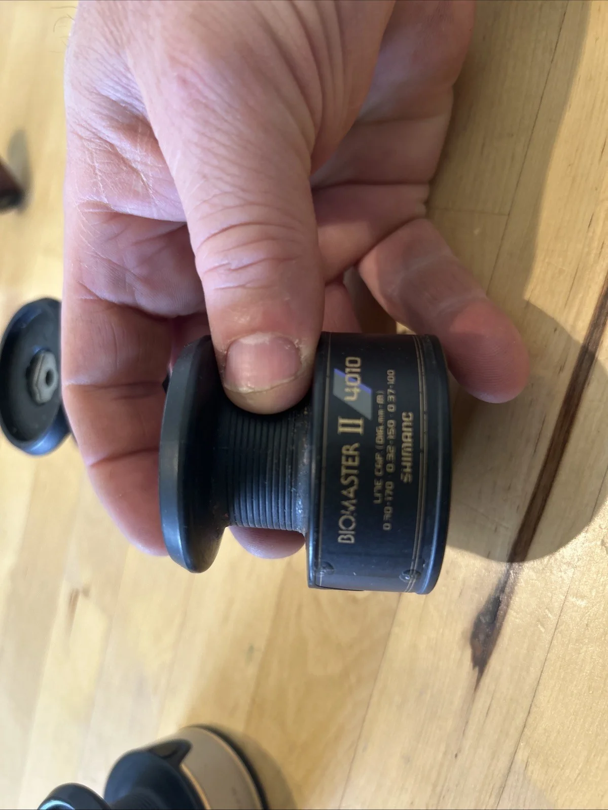Spare spools to fit Shimano Biomaster II 4010 models. 2 are Biomaster spools the third is from an Aerocast 4010 but this is the same model spool and also fires Biomaster 4010. All line clips and clickers present and correct.