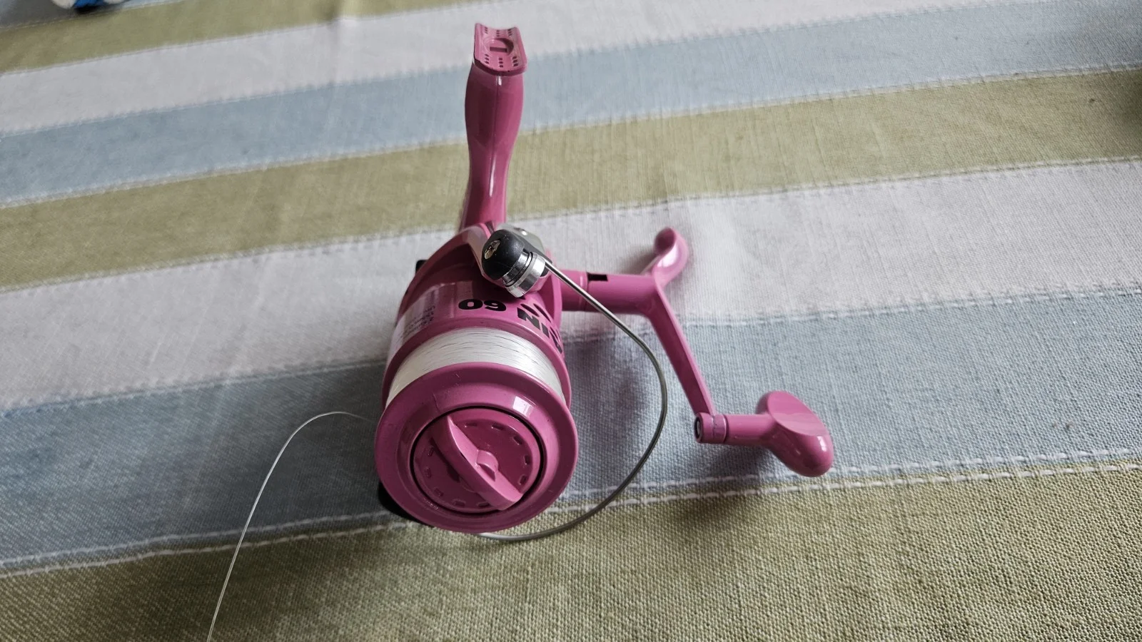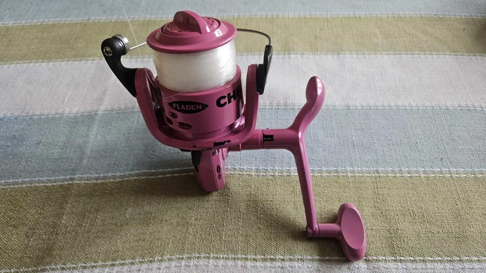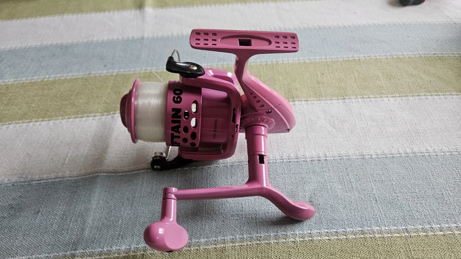 fladen chieftain 60 fishing reel in unusual pink colour. very little use, has a couple of areas where the paint has been worn but still fully functional