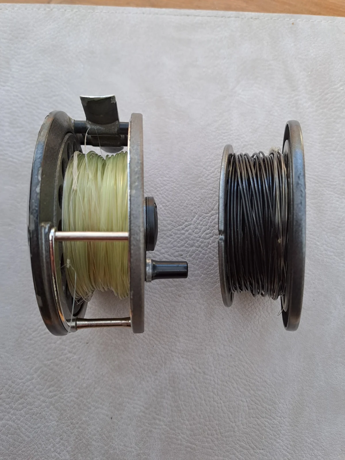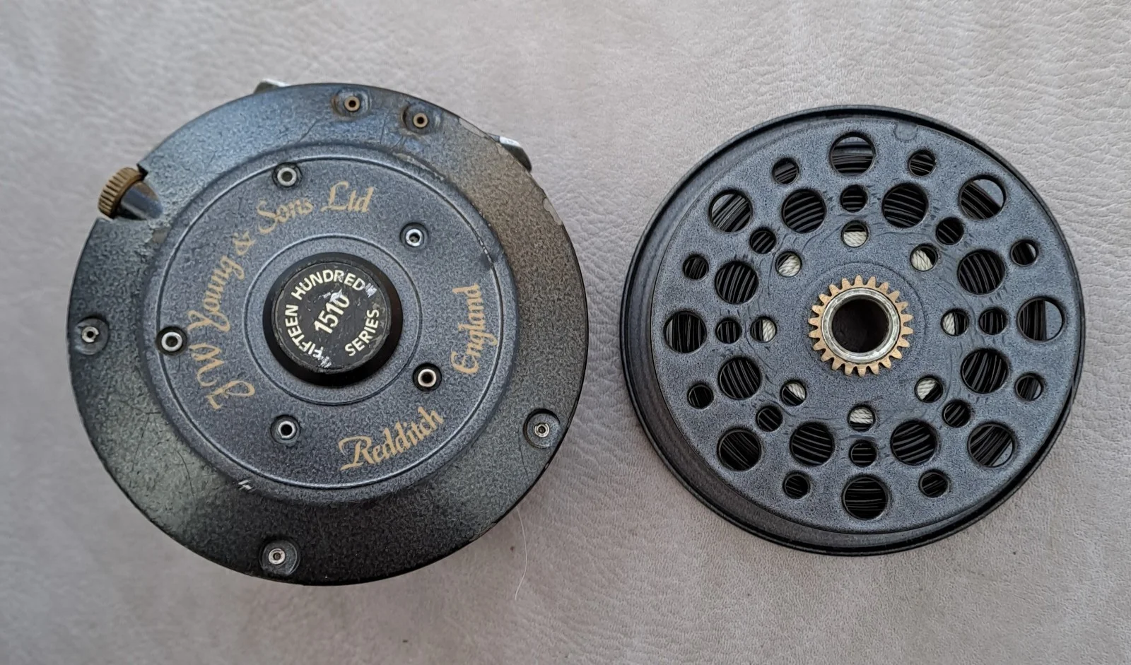 A JW Youngs 1510 fly reel in good used condition, great order and ready to use, with a spare spool. A multiplier so one turn of the handle causes two turns of the spool and therefore picks up line really quickly. both spools are loaded, one with a clear intermediate line and one with a DT8 fast sink