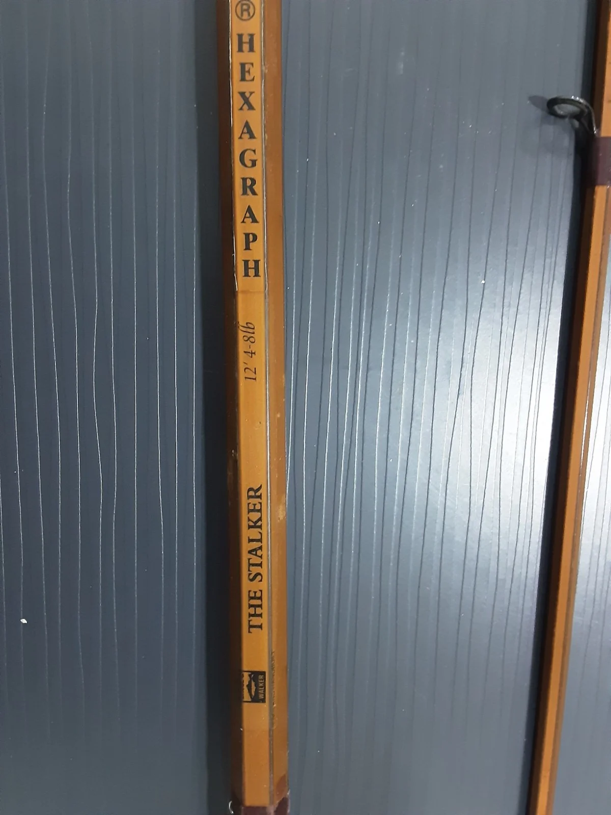 Very rare Bruce and Walker Hexagraph 'The Stalker' Custom made avon style rod . 2 piece 12 feet long and a line wieght suggestion of 4-8lb with a test curve of 1 1/4. With a progressive action it is a superb fish playing rod. The cane coloured blank matched with cork handle and red whipping give the rods a traditional feel and in very good condition.The rods comes with a JW young Solid canvas rod tube. The tube is tatty (see pic) but very usable and a good fit for the rod.Rods are located in SW Scotland and a long way from everywhere. would much prefer the rods were collected, where you can also try and view before you buy. Maybe even have a few casts in the loch beside my house. Please see my other listing for some equally special hexagraph carp Rods.. Will consider offers for all three rods.I also have a well used 11ft 1 1/4 tc Avon Hexagraph as well that may be be available to make the trip to view even more worthwhile.More than happy to send further pics and answer any questions. Also happy to take advice on postage and couriers if you are unable to visit..................