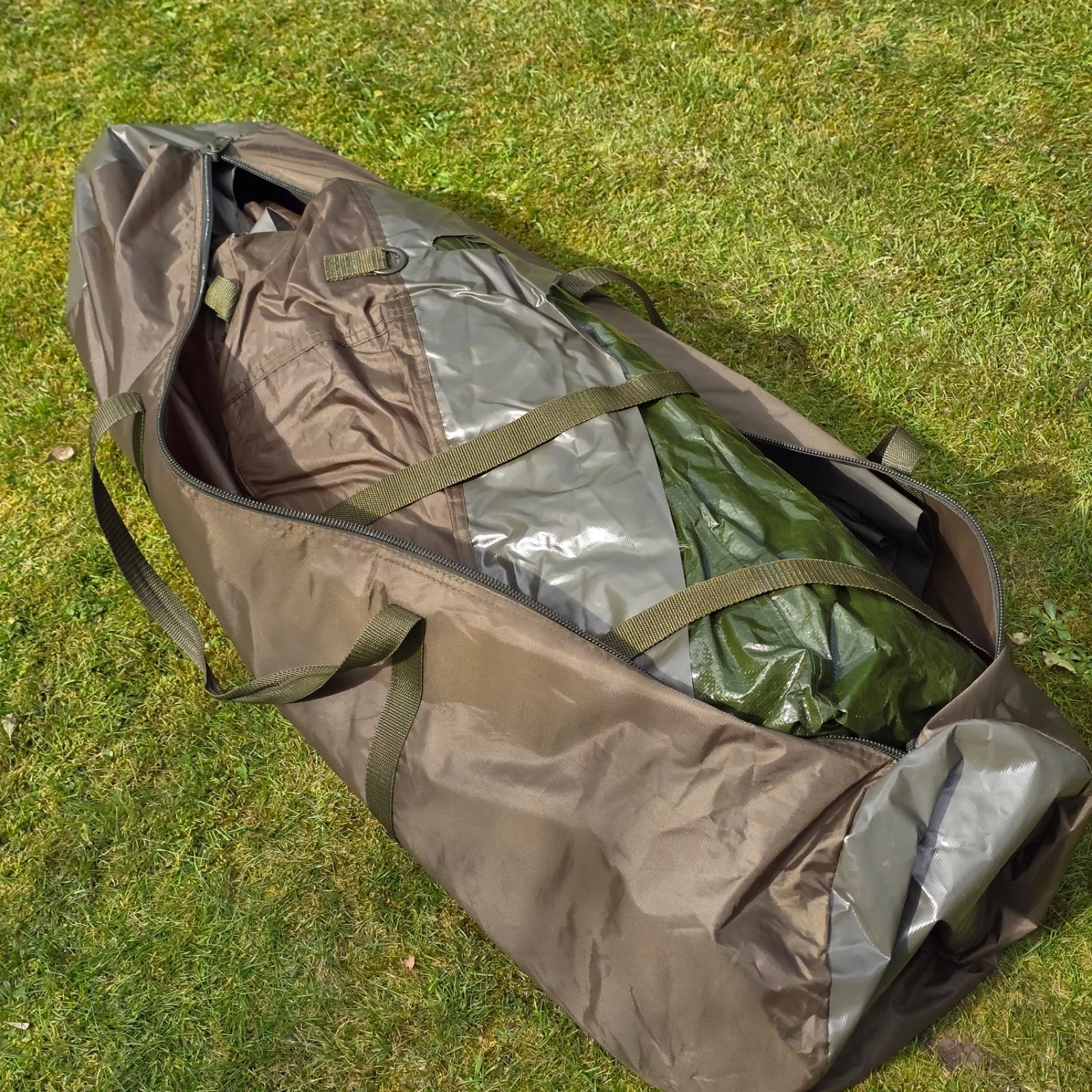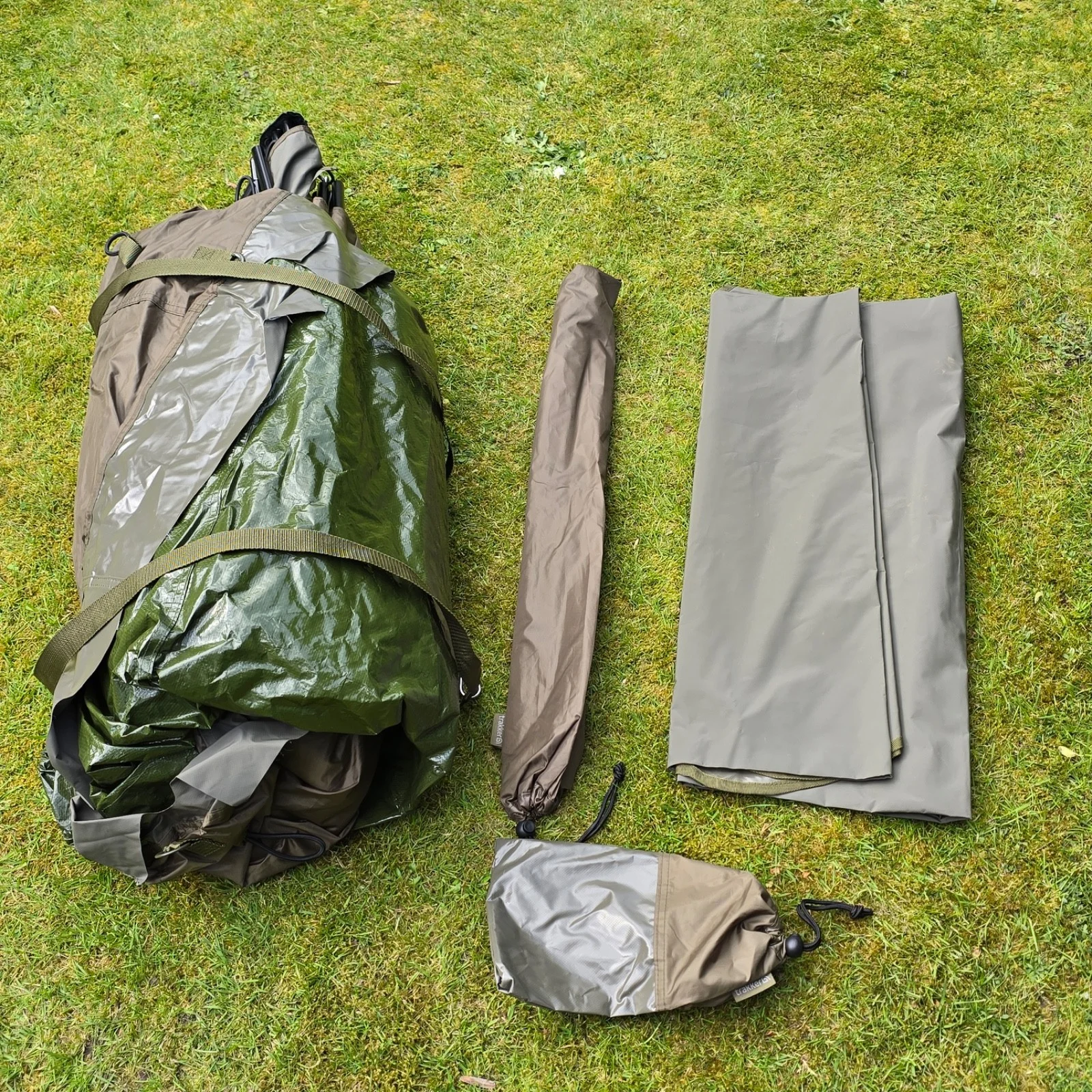 Only used once in dry conditions so practically newFully-enclosed, twin-skin inner capsuleStitched-in groundsheet and receiver pocketsZipped rear vent for increased ventilationPeak to front of bivvyFrame supports for extra stability in adverse weatherDual-zipped doors allowing you to create a letterbox openingTie-backs for door and side panelsDual rod strapsHeavy-duty groundsheetSupplied with tension strap, carrybag and T-pegsCompatible with 203200 Clear window (available separately)Upgraded 10,000mm Hydrostatic Head fabric1 Man BivvyMaterial: polyesterWeight: Approx. 7.6kg (plus pegs and groundsheet weighing 2.8kg)Dimensions Bivvy: Approx. 130cm H x 225cm D x 280cm WDimensions Capsule: Approx. 125cm H x 215cm D x 260cm WTransport Size: 100cm x 30cm