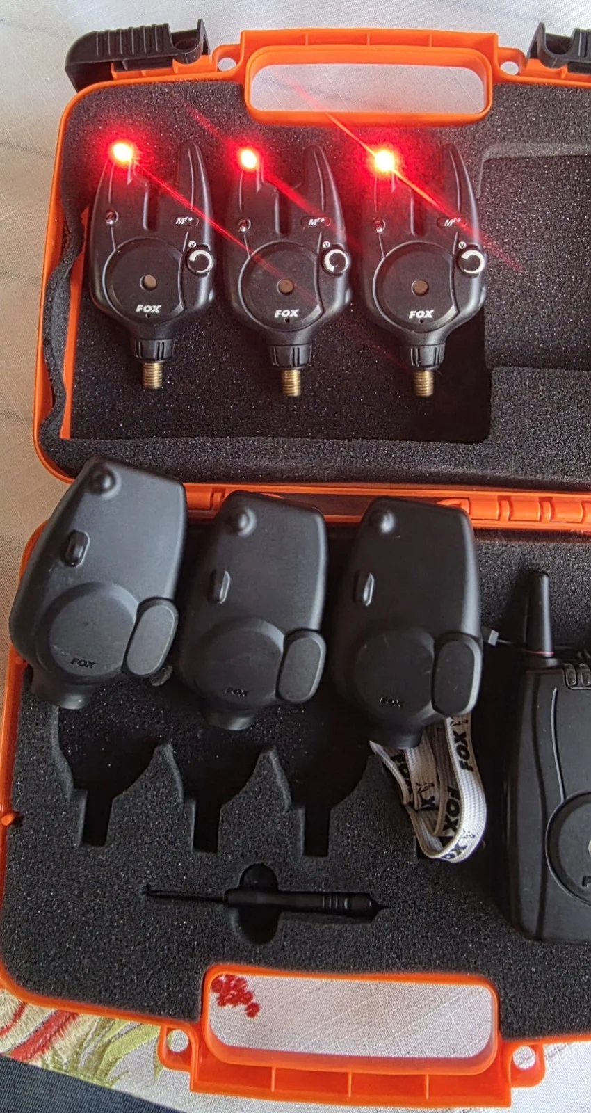 3x Mr+ bite alarms with red led, and covers,1x Mr+ receiver,3x fox bobbins,carry casewith batteries.all works as it should.