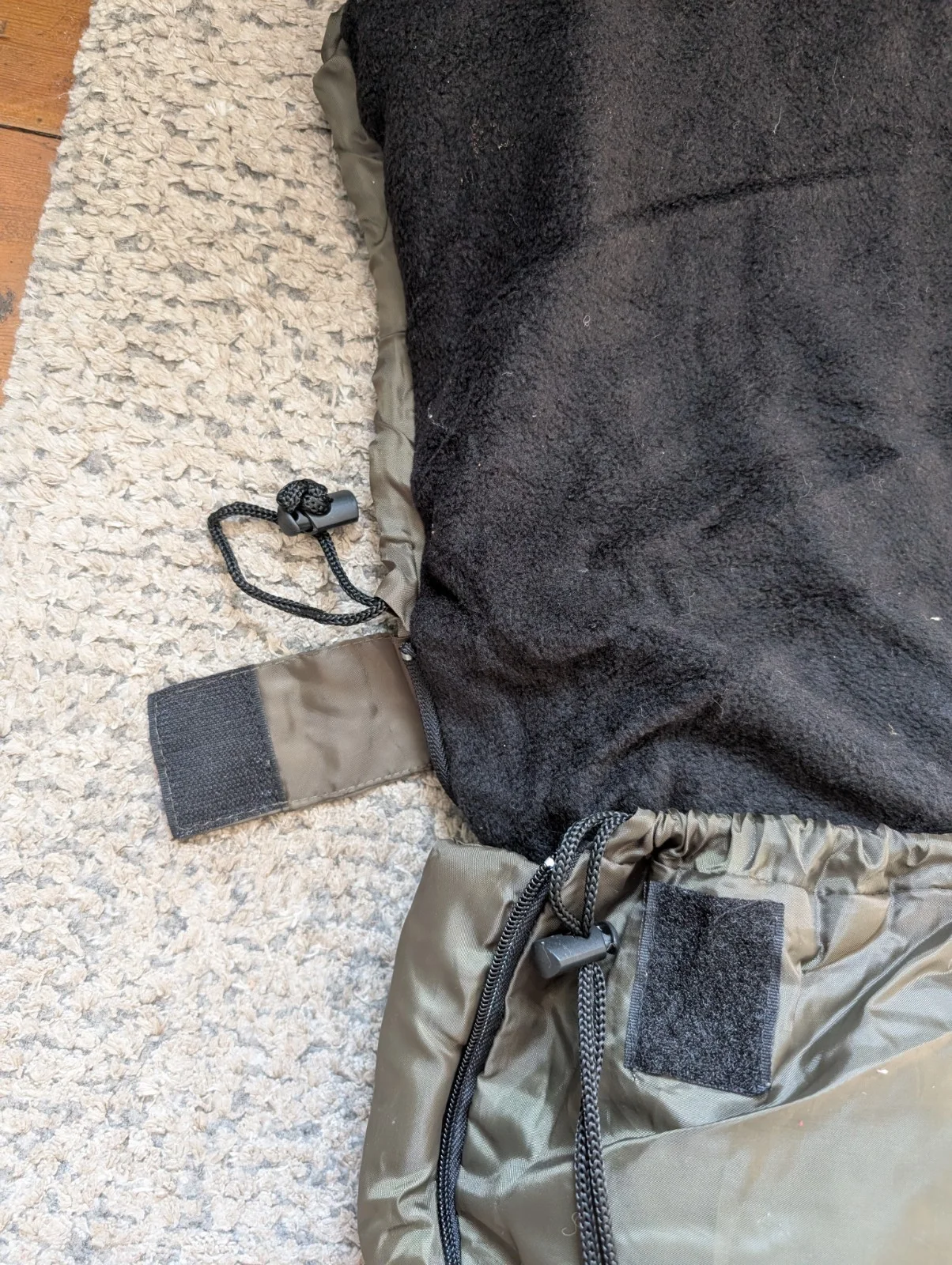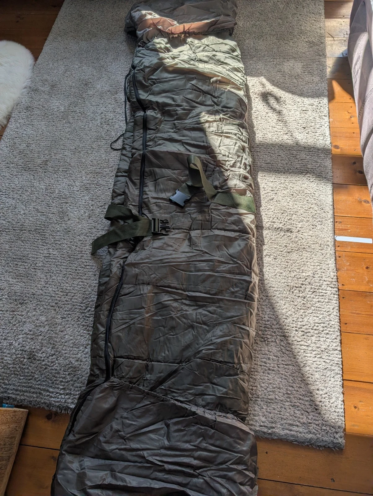 TF gear bedchair sleeping bag with elasticated hoods at each end, and adjustable strap to attach to a bedchair. Crash zips on both sides, fully working, with drawstring top to pull in snug around the shoulders, and a fleece lining. Only used a handful of times when taking the kids fishing. No longer required. 2 available.