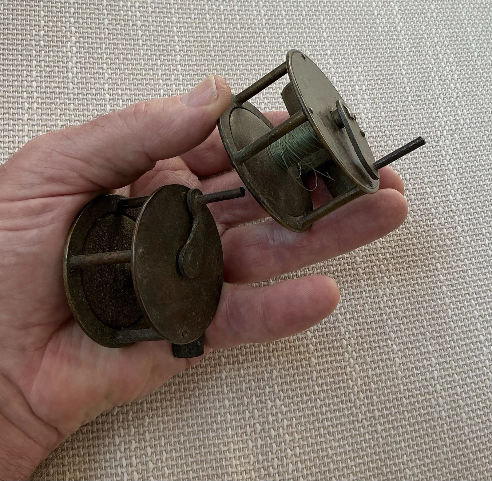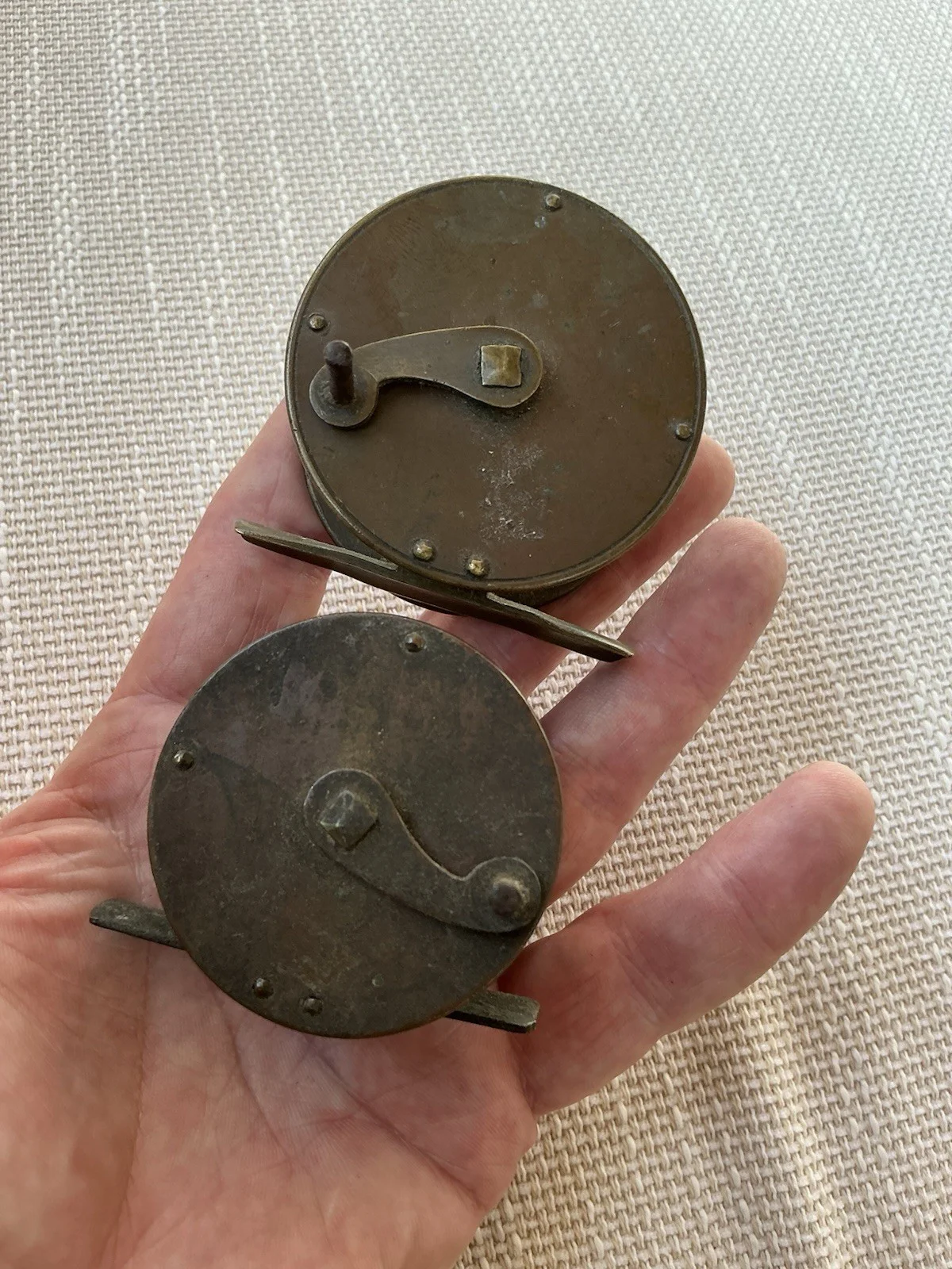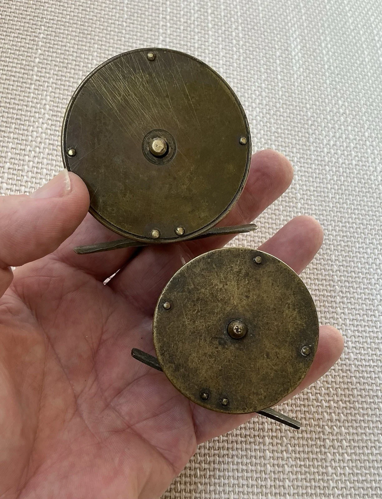 Two early brass reels , both missing there handles .Hopefully somebody will be able to restore these reels back to their glory .