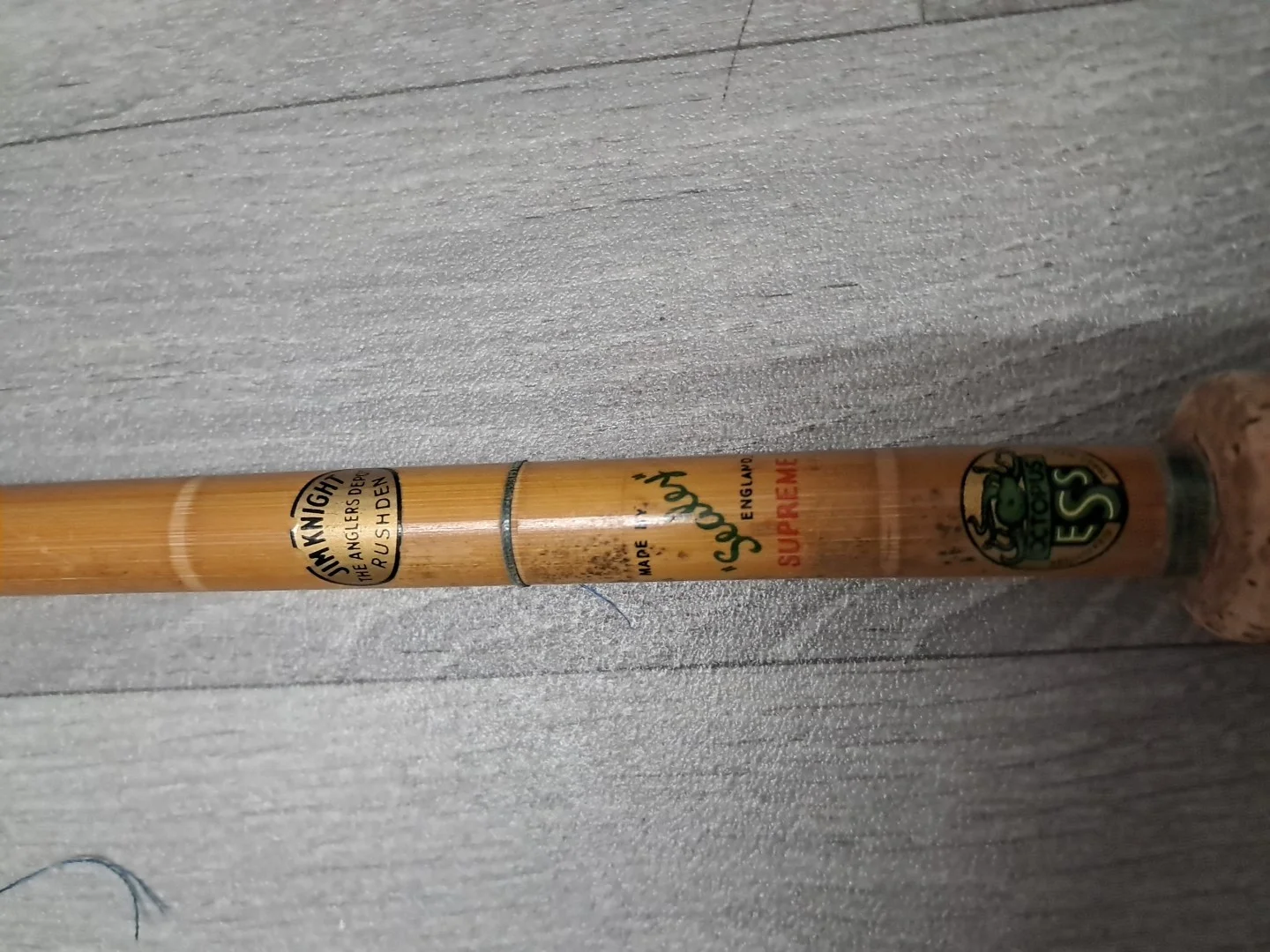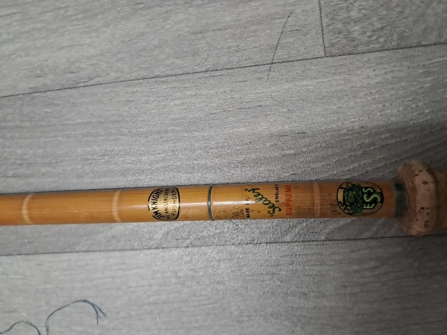 sealey supreme hand made in rushden northamptonshire finest bamboo Fishing rod 1960s in good condition couple of eyelets missing end eyelet loose no splits or cracks on the bamboo anywhere eyelets missing brass ends on each part Cork handle 13 to 15 foot long