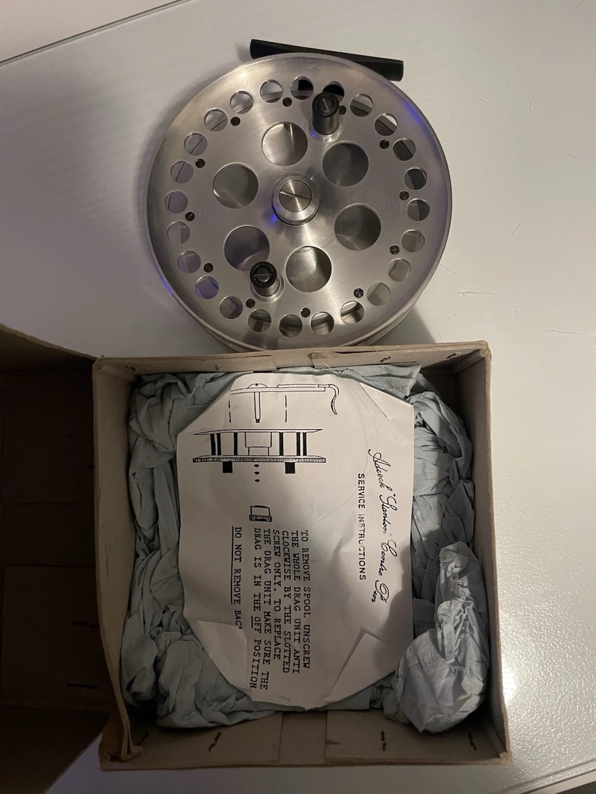 For sale is a genuine Adcock Stanton Centre Pin Reel, made in Nottingham, England.A high-quality traditional British centre pin reel, ideal for river trotting and float fishing, or for collectors of classic fishing tackle.Included: • Original Adcock Stanton Centre Pin Reel • Original Box • Original Service Instructions / PaperworkCondition:The reel is in excellent used condition.It spins smoothly and feels solid as it should.Very clean example with minimal signs of age-related wear.The original box and paperwork are included, which adds to the collectability and value.Please study all photos carefully as they form part of the description.⸻This is a quality English-made centrepin from a respected maker — becoming harder to find complete with box and paperwork.📦 Will be securely packaged and sent via tracked delivery.❌ No returns – sold as seen.
