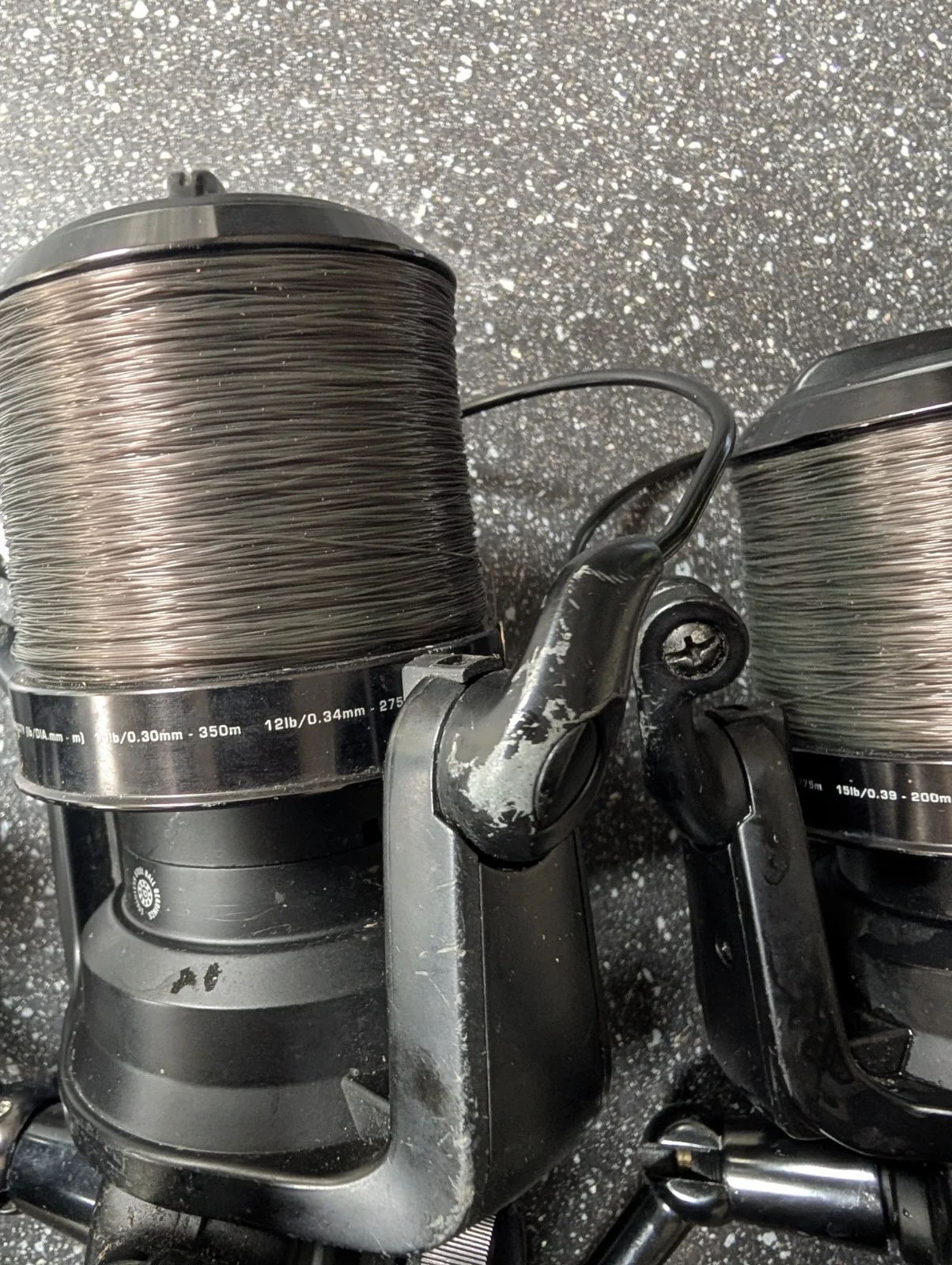 3 x fox eos 12000fs reels with spare spools , some paint damage and 1 bent bail arm , all working perfectly find otherwise.main spool 15lb and spare 25lbThe product is a set of three Fox EOS 12000 FS reels, specifically designed for coarse fishing. These reels have a gear ratio of 4.5:1 and come in a sleek black colour. Each reel also includes a spare spool, providing anglers with extra options for their fishing needs. The Fox brand is known for its quality and performance in the fishing world, making these reels a reliable choice for any angler.