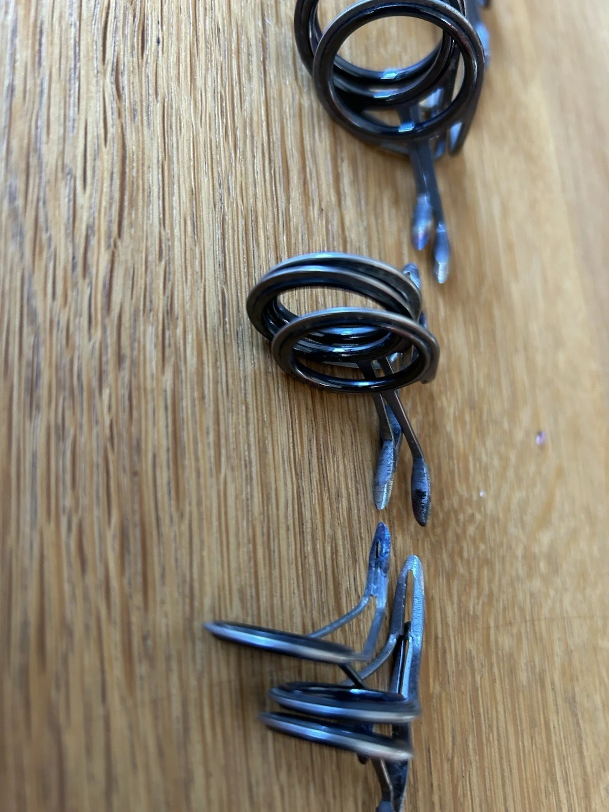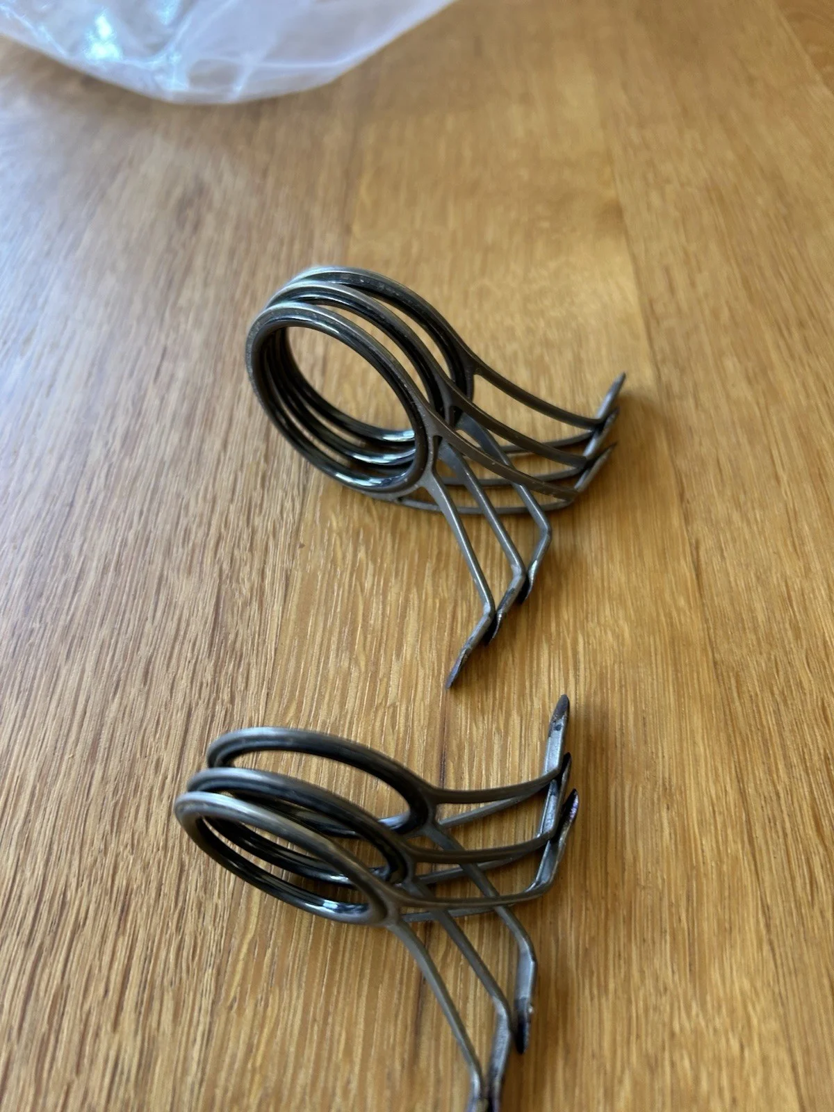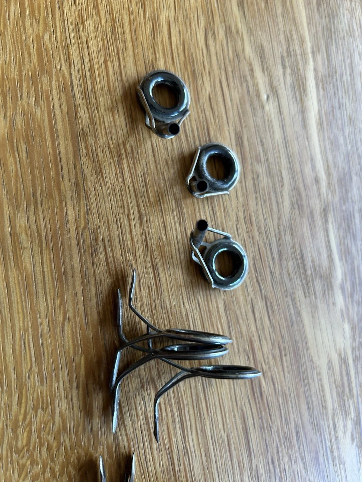 Free Spirit Rod Guides 50mm X 3 Setstaken off hi’s rods, still in good useable condition but may have tiny use or wear marks as they are used guides.50,40,30,25,20. 16mm braid tips with2.8 bore, gunsmoke finish.