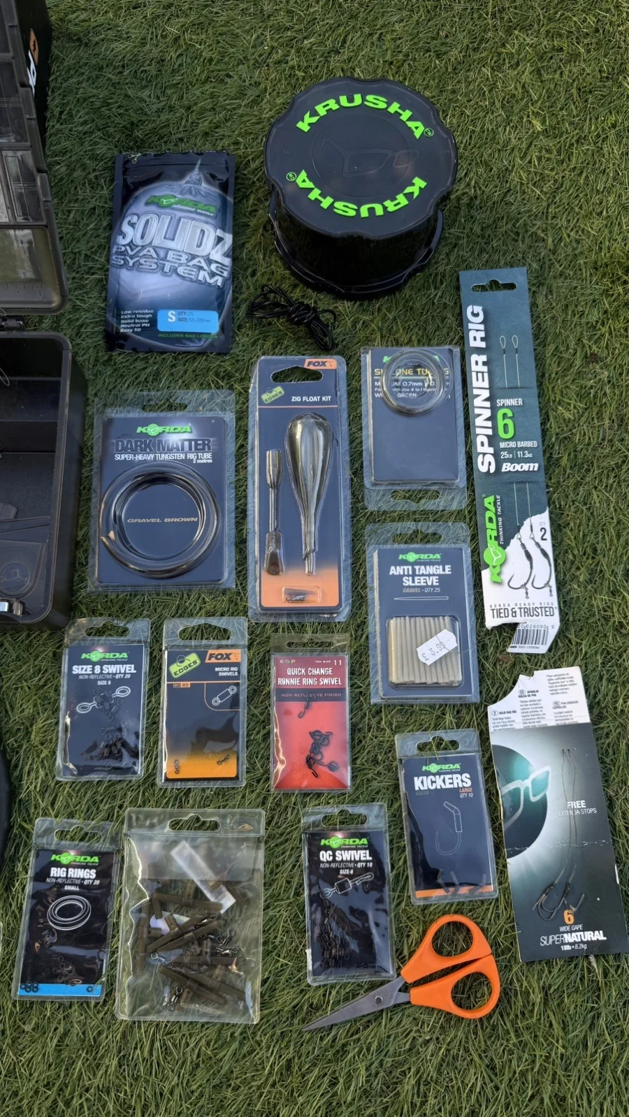 Korda massive tackle box bundle carp fishing job lot.Too many items to list individually, so please study the photos carefully for everything included. This is a complete kit to get you going and includes a wide mix of carp terminal tackle and rig bits including hooks, leads, swivels, sleeves, line accessories and more.Also includes a Korda Krusha and a brand new unopened Prologic Trans Camo rig water bucket for testing rigs. Everything else is used, and some items have been used from the packets, so please check the pictures closely to see exactly what is included and the condition.A great carp fishing job lot with loads of useful tackle and ideal for anyone wanting a ready-made bundle.