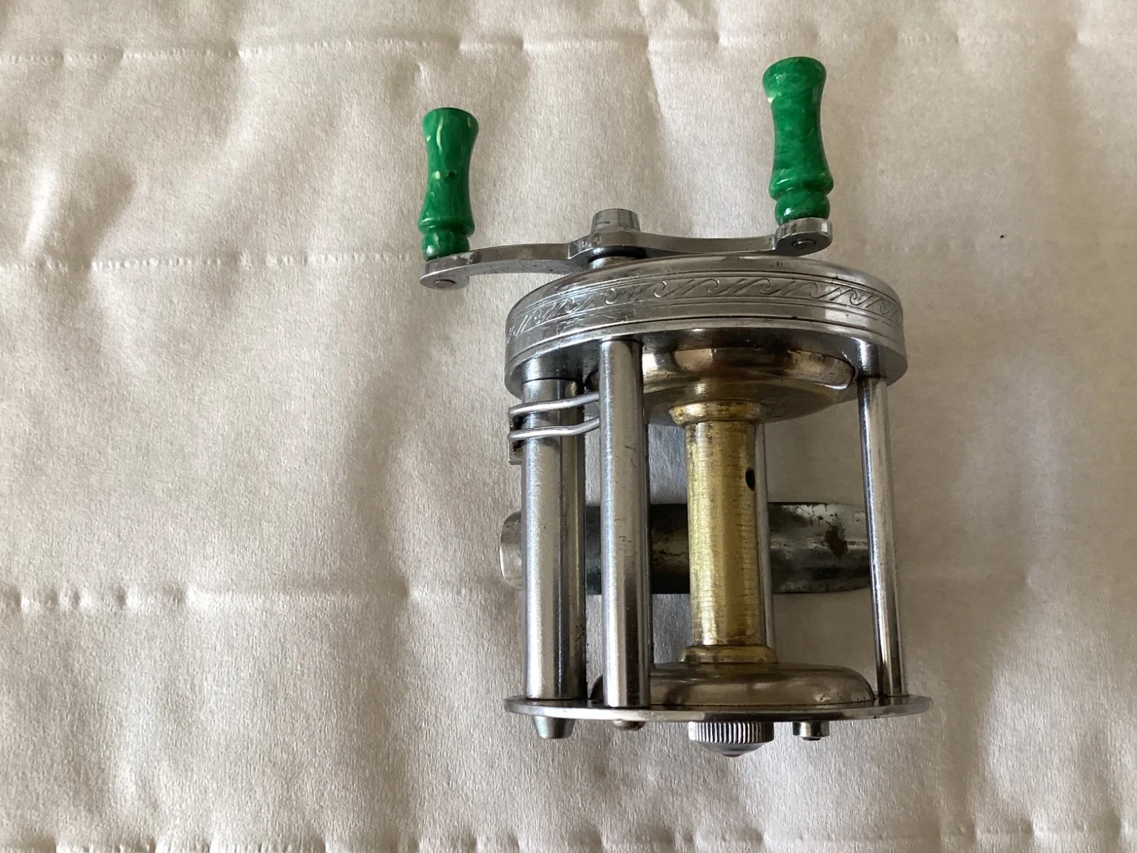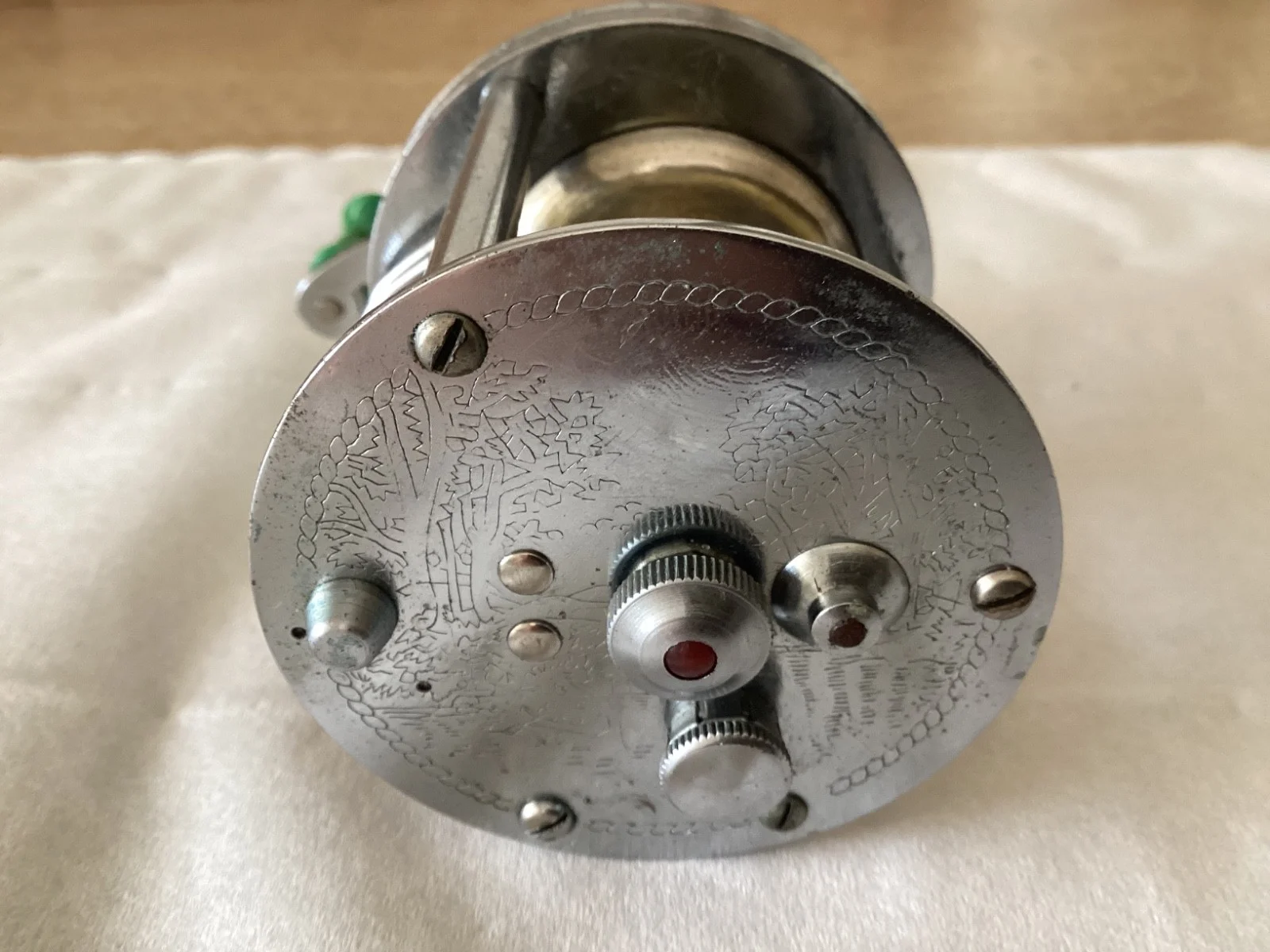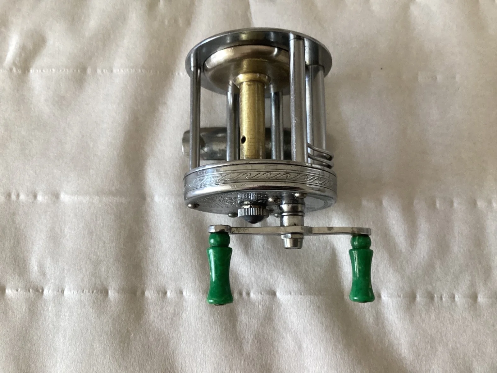 Vintage fishing reel Shakespeare Criterion reel 1961 HE model in good used condition . Turns freely with nice loud check green handels and made in USA on foot a nice engraved reel . Sold as seen uk only please