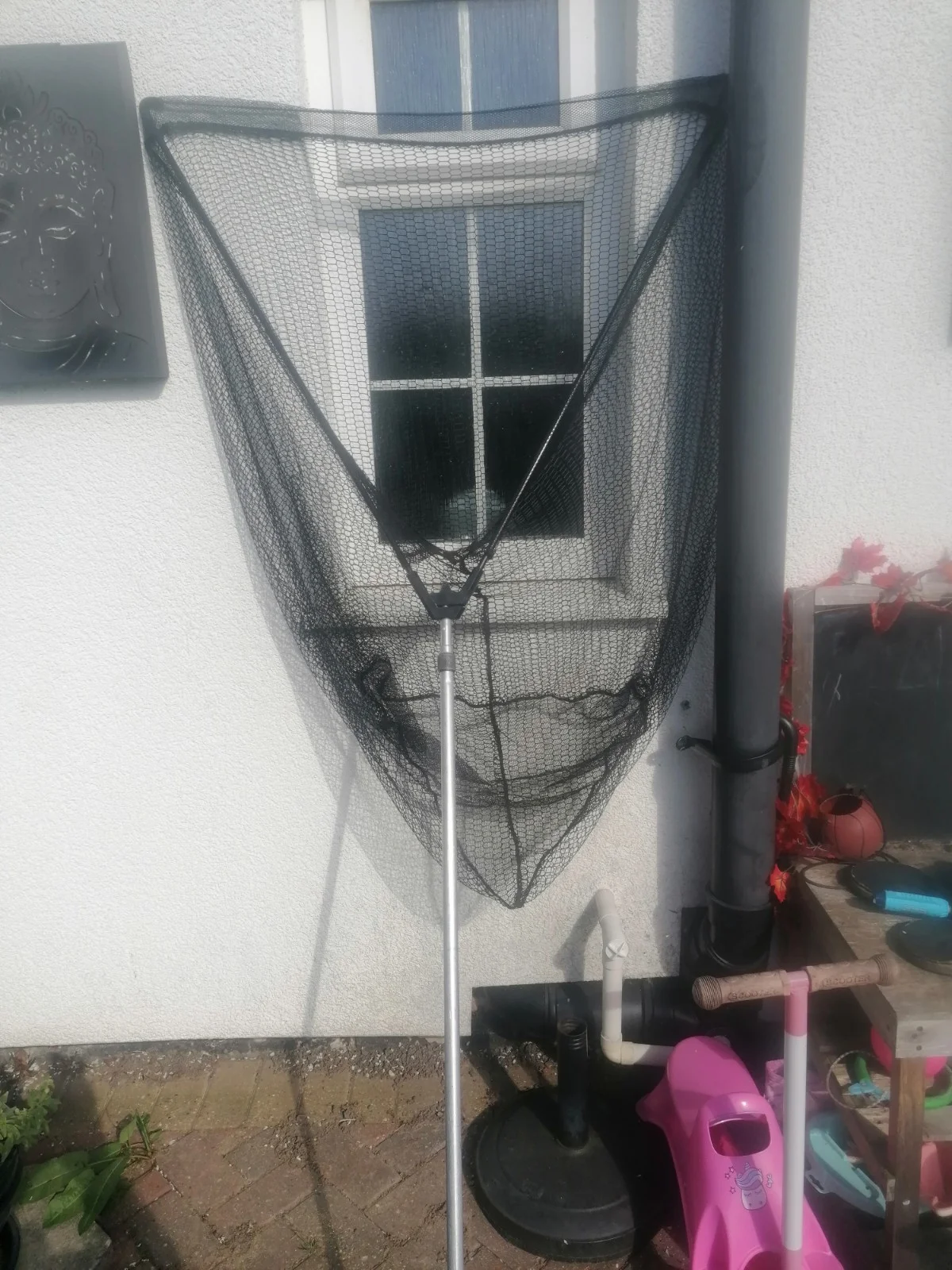 Here is a used but in very good condition large triangle Landing Net with extendable handle