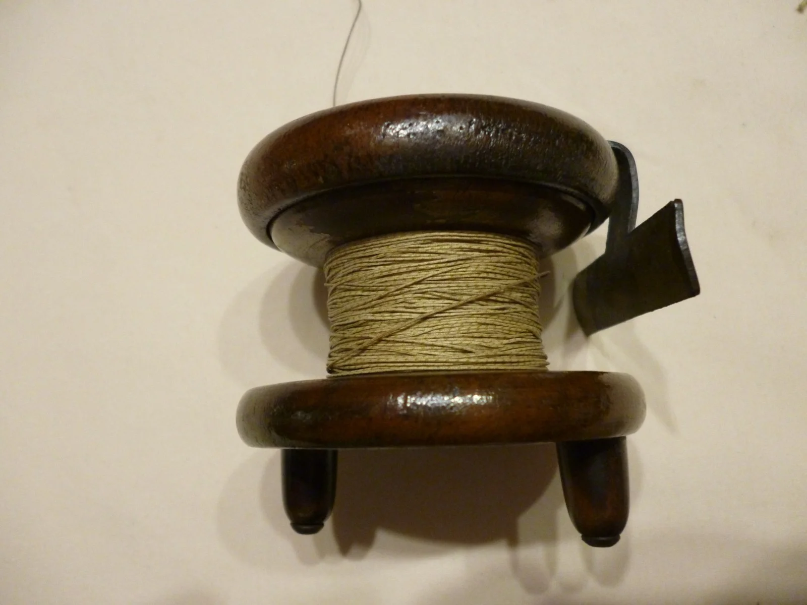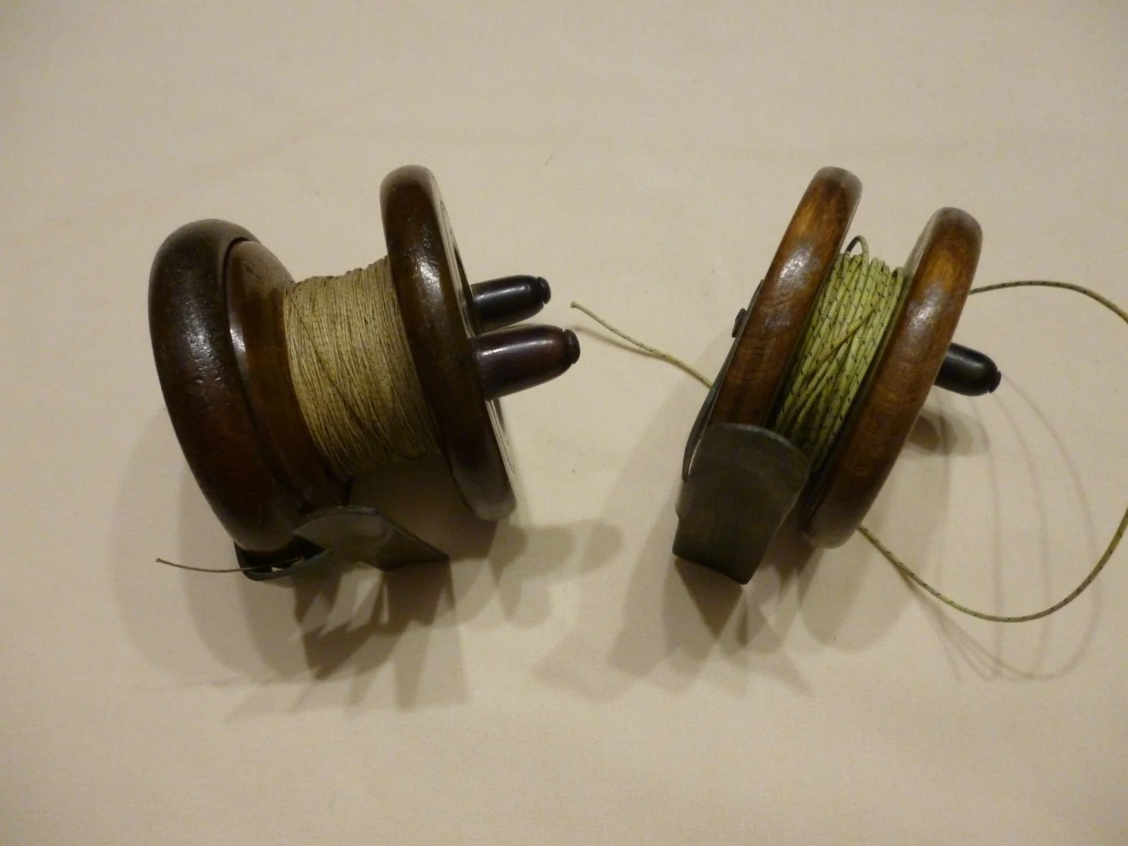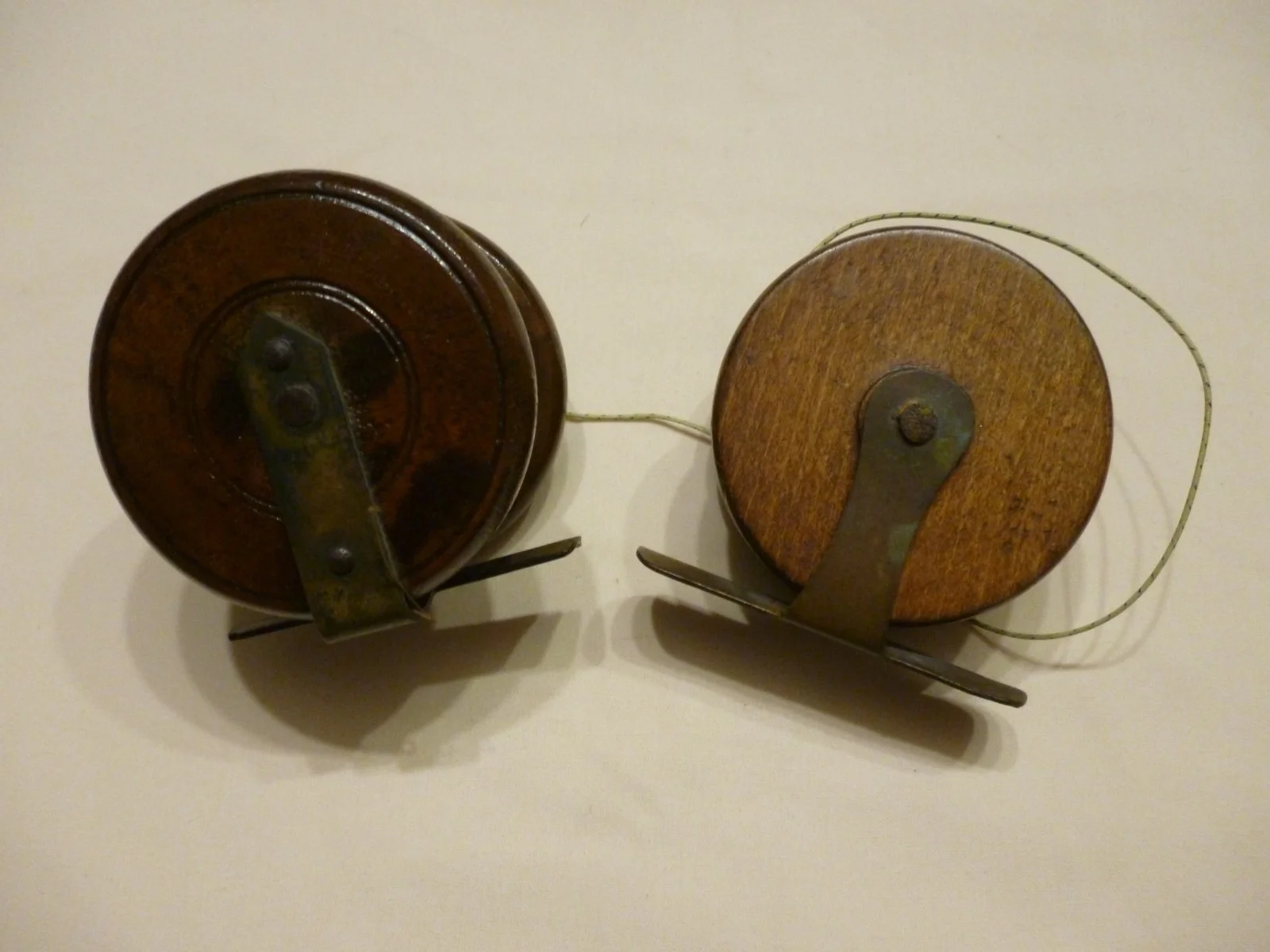 2 lovely small wooden reels, both 2 1/2" dia. The wide drummed spine back has an unusual ratchet system, as shown, with twin bone handles and a brass foot and spine. The other is a 'little boys' reel, which is just a nice wooden drum turning on a spindle from the back brass spine and foot. Nice shelf items, although both are in great working condition. Please see all photos.