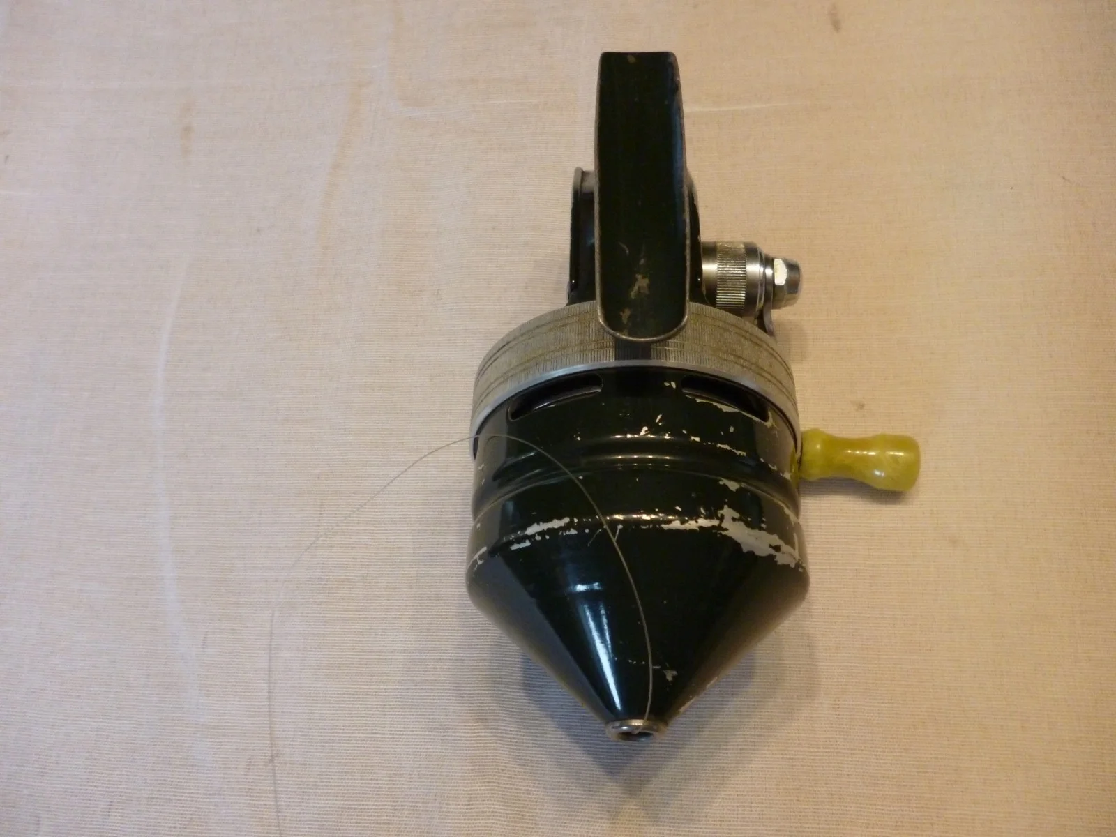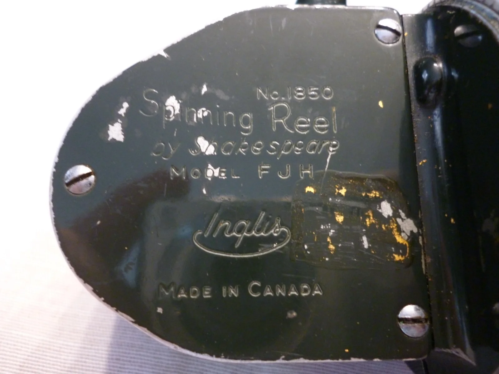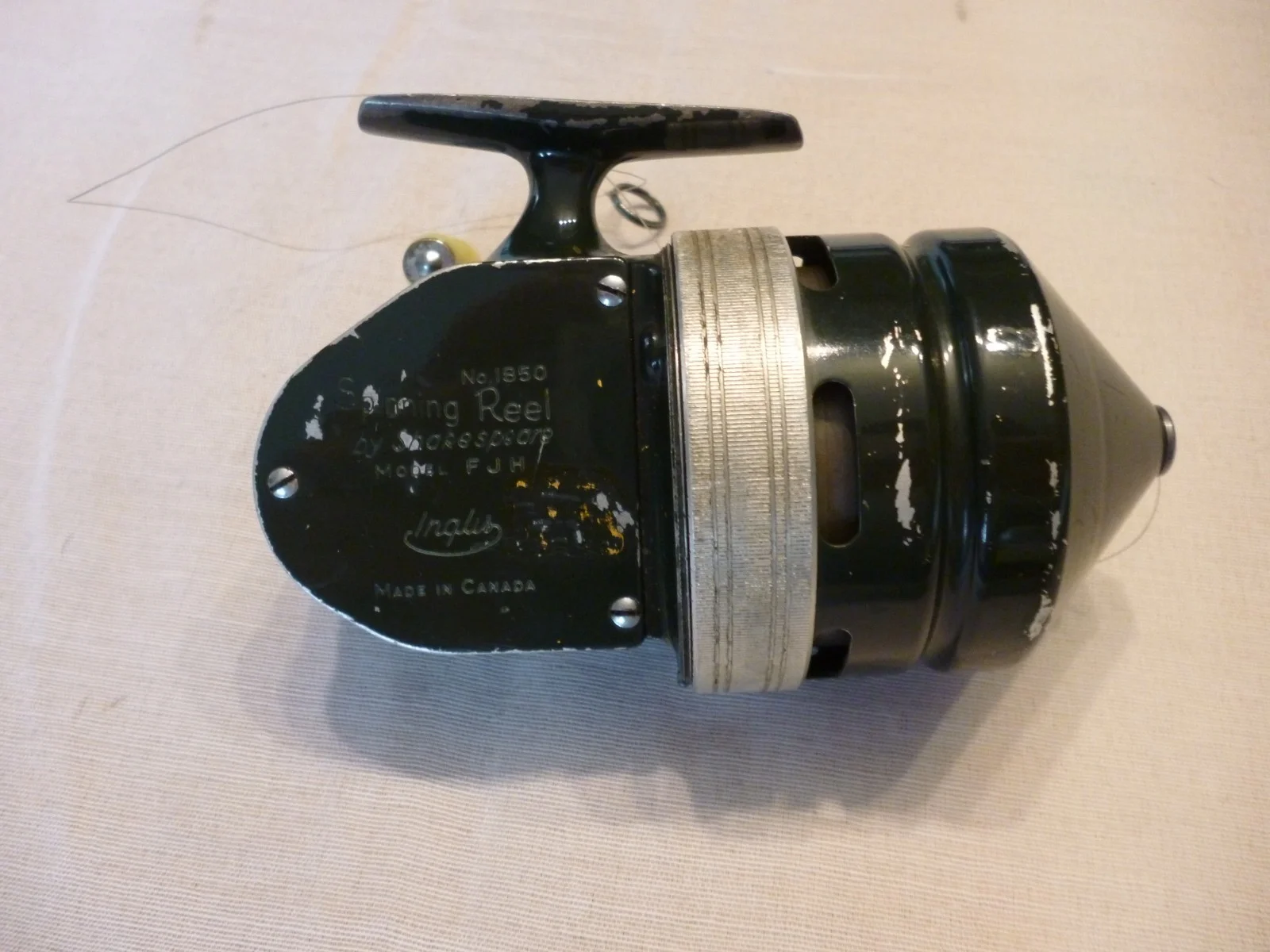 Unusual closed face spinning reel, model FJH, made in Canada by Shakespeare. Details stamped on the side plate, with No.1850 and Inglis, as shown. The line pickup is released, for casting, by back winding the handle and the drag is adjusted by turning the front cowl clockwise or anti clockwise. Lovely mottled handle with anti reverse collar on the shaft. In great working condition with only slight loss to the original finish. Please see all photos. Great shelf piece or unusual user.