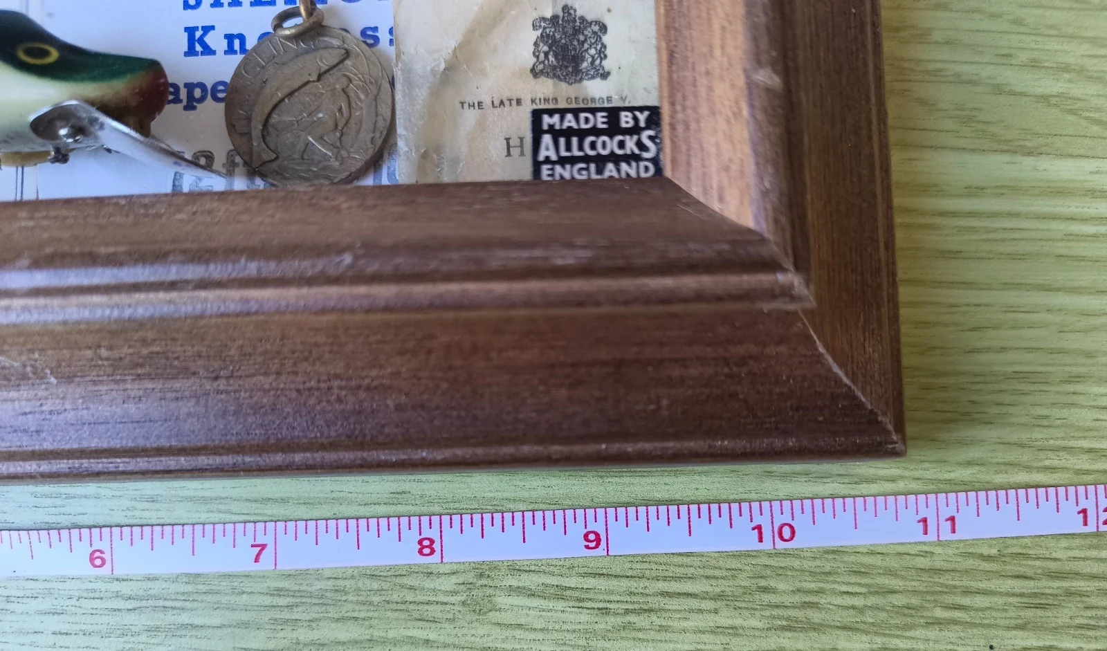 Vintage Allcocks Fly / Trout / Salmon Fishing Shadow Box Display CaseSize 11 x 11 inches Vintage display case by Allcocks containing a variety of fly fishing memorabiliaGlass front with wooden frame