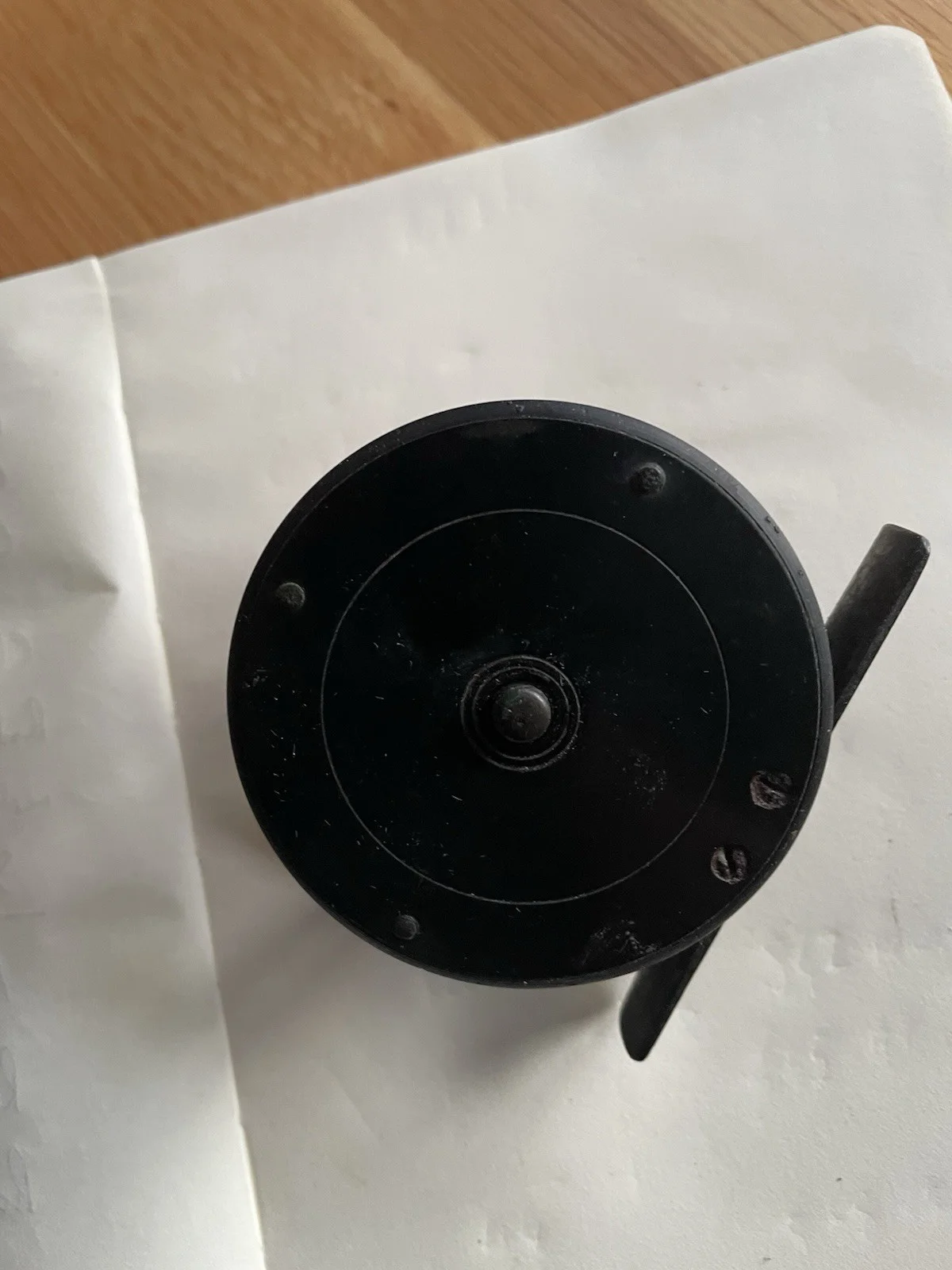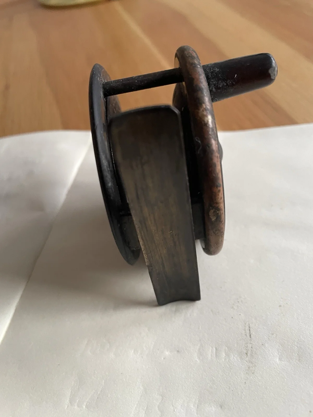 Very old, I know nothing about this reel- given to me and in cupboard about 30 years ago- time to declutter.Diameter 2.5 inches, drum about 1inch wide.Needs a clean.Please see my other itemsThanks