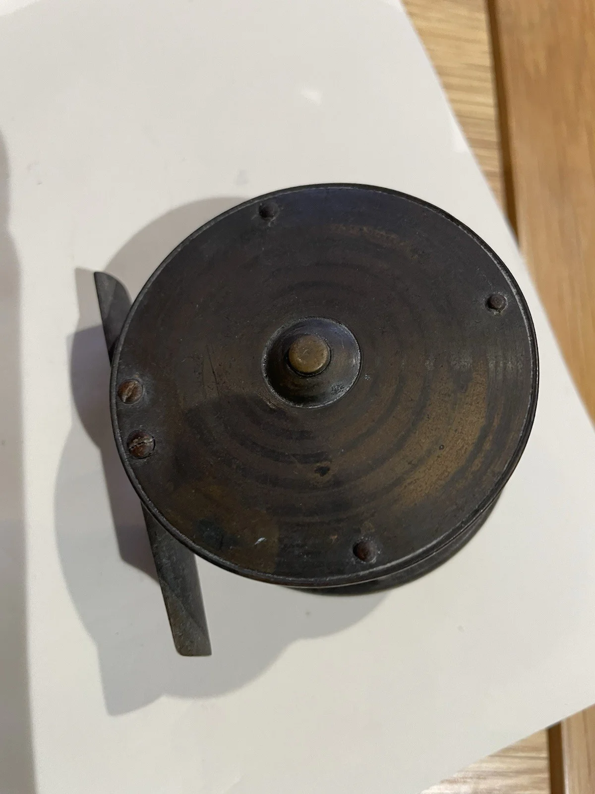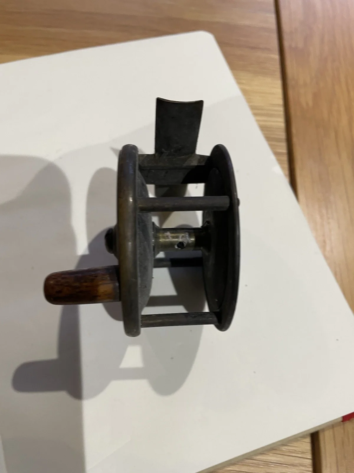 Vintage Small brass reel 6cm diameter x 1 inch gap between drum.Appears to have wooden handle with strong ratchet.Clearing out Please see other items Thanks- more to followThanks