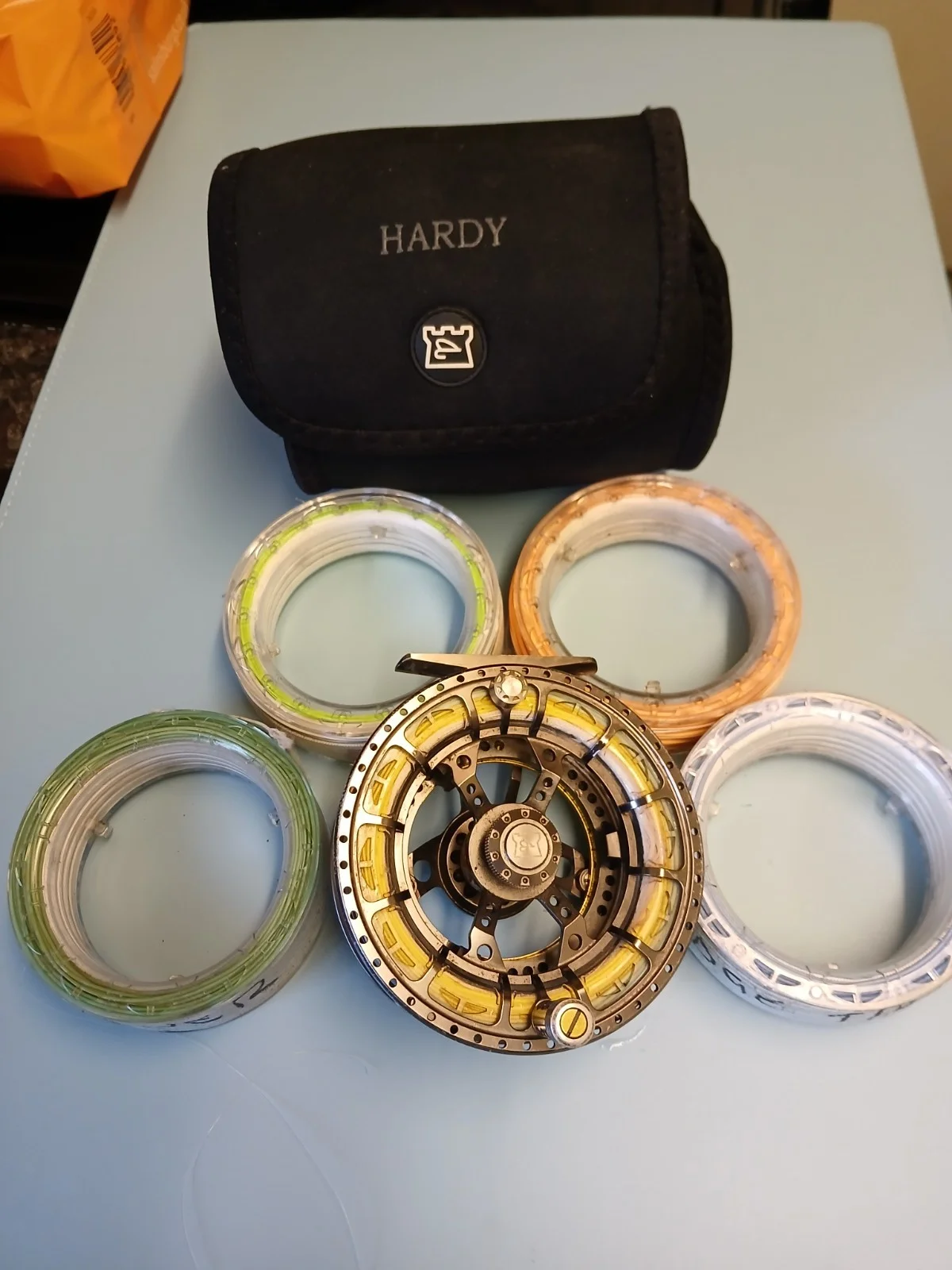 asr 5000 reel in good condition, comes with 5 cassette spools with line, 2 floating,hover,10' midge tip and 5' midge tip Hardy reel case