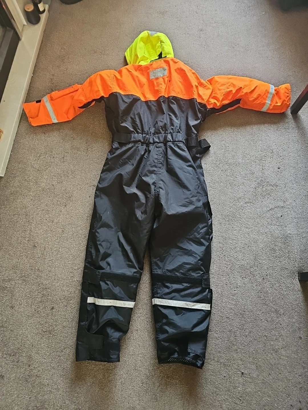 Fladen Rescue System Flotation / Immersion Suit – Size L (ISO 15027-1)High-quality Fladen Rescue System immersion/flotation suit designed for offshore and extreme cold-water environments.✔ Certified to ISO 15027-1 (Immersion Suit Standard)✔ EN 393 flotation aid compliance✔ Designed for thermal protection and buoyancy in cold water✔ High-visibility orange with reflective strips✔ Waterproof, windproof, and insulated✔ Integrated hood with hi-vis lining✔ Adjustable waist belt for secure fit✔ Heavy-duty construction suitable for offshore useCondition:Used but in very good condition. Clean and fully functional with no major damage.Size:Large (L)This is a genuine survival suit designed to help retain body heat and provide buoyancy in cold water, making it ideal for serious marine use.Ideal for:Fishing 🎣Sailing ⛵Offshore work 🌊Cold weather / survival use ❄️Stored dry no rips or tears, all zips good and minimum use.