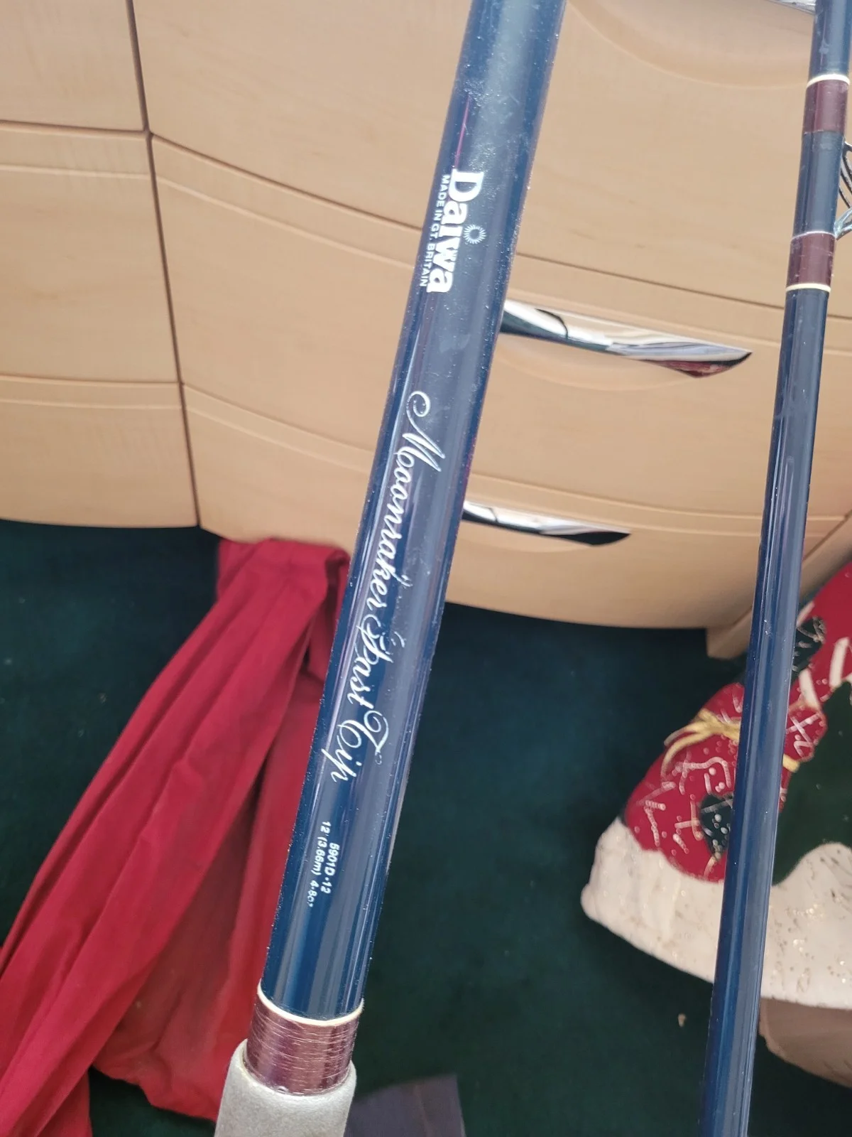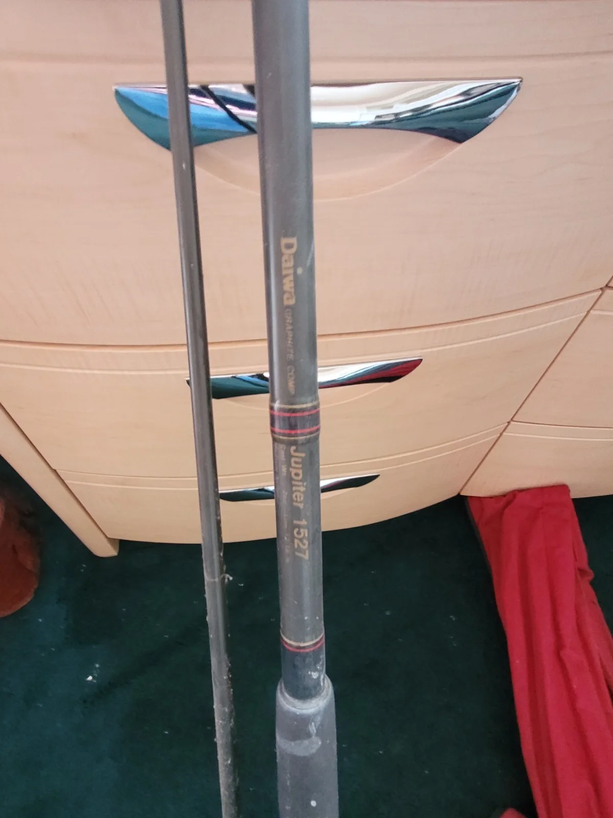 3 fishing rods , 2 reels , plus Rod Stand, estate sale no longer used collection only from Sittingbourne
