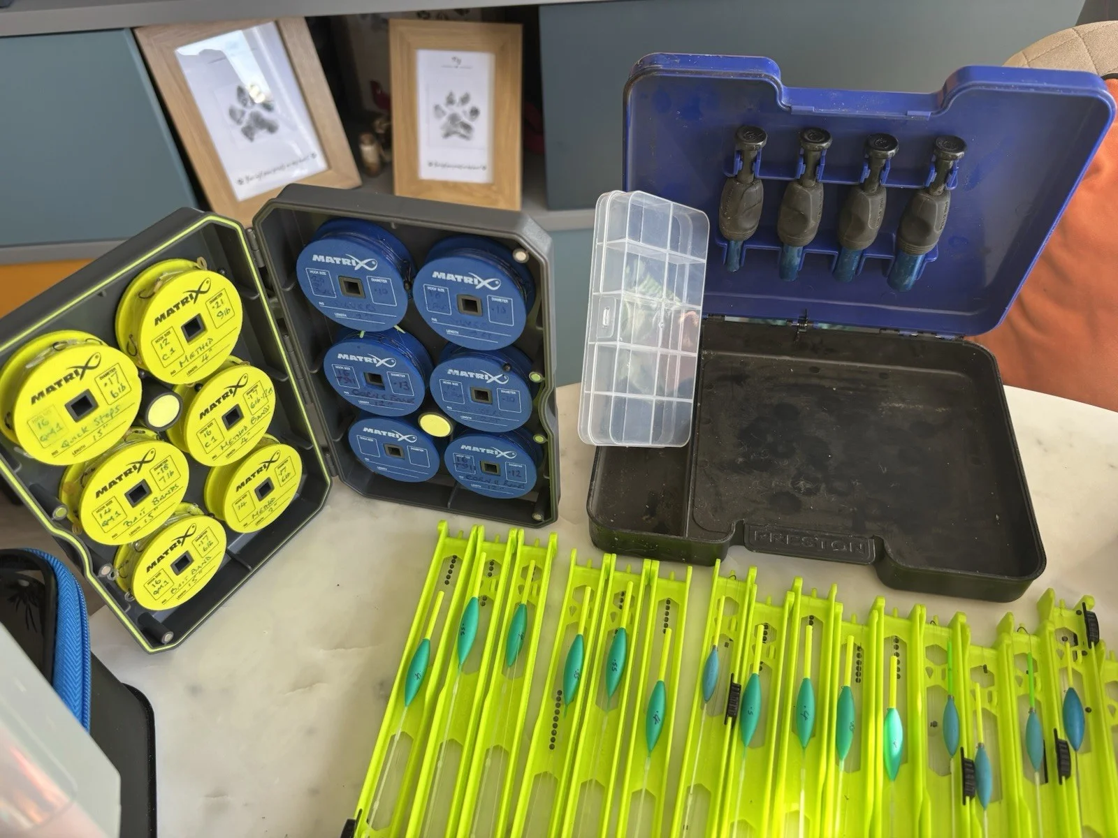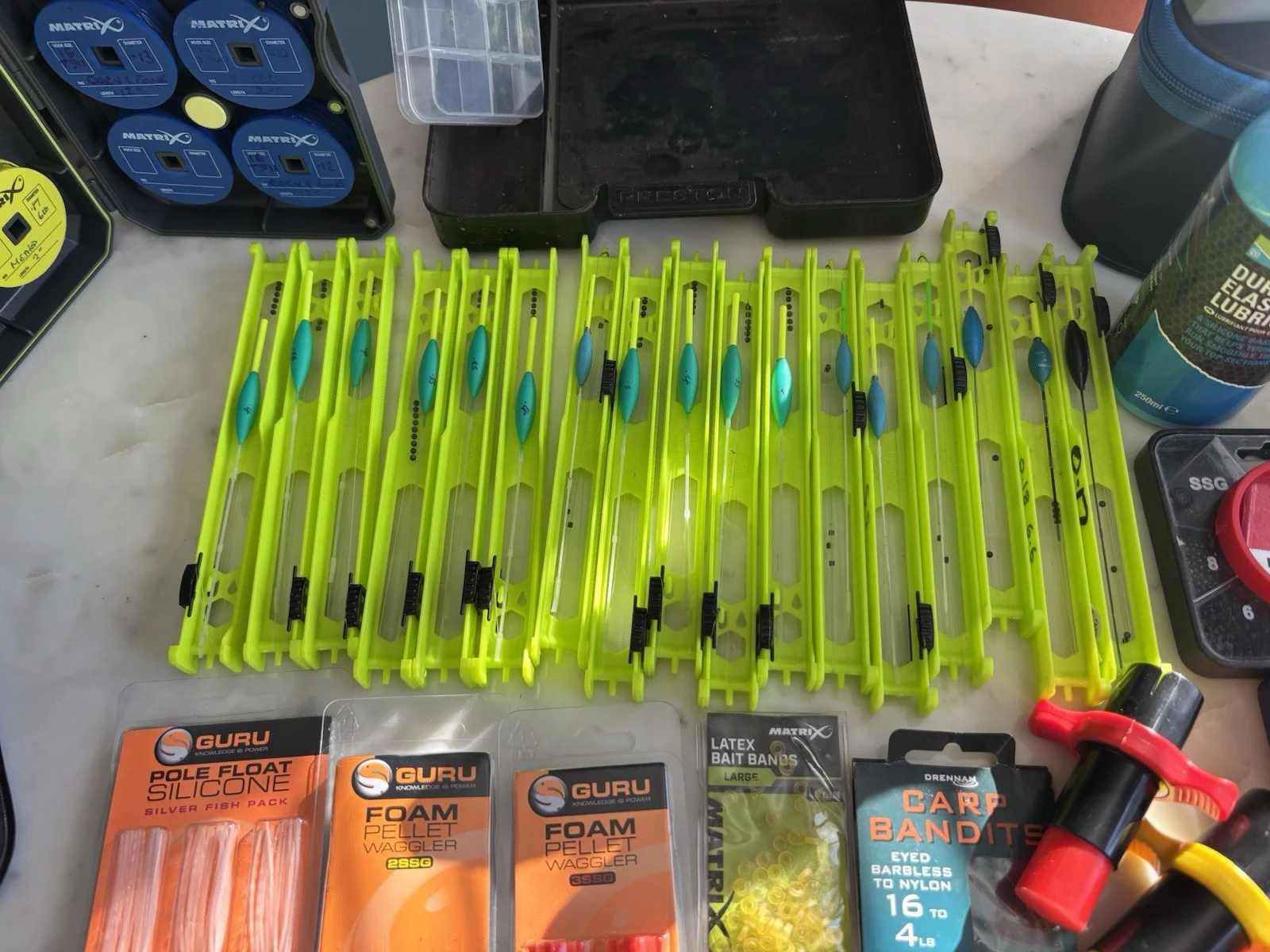 Joblot match fishing tackle 3 Preston’s hooklenght cases 2 Drennan catapults 2 Preston’s EVA cases Preston’s bread punch Matrix hooklenght cases with spools with pretied rigs .Huge amount Preston’s feeders and cubes Malman pole rigs . Guru floats , matrix, Drennan pellet wagglers , Preston’s meat punches etc etc etc.Please look at pictures as to what you are getting .Collection welcome