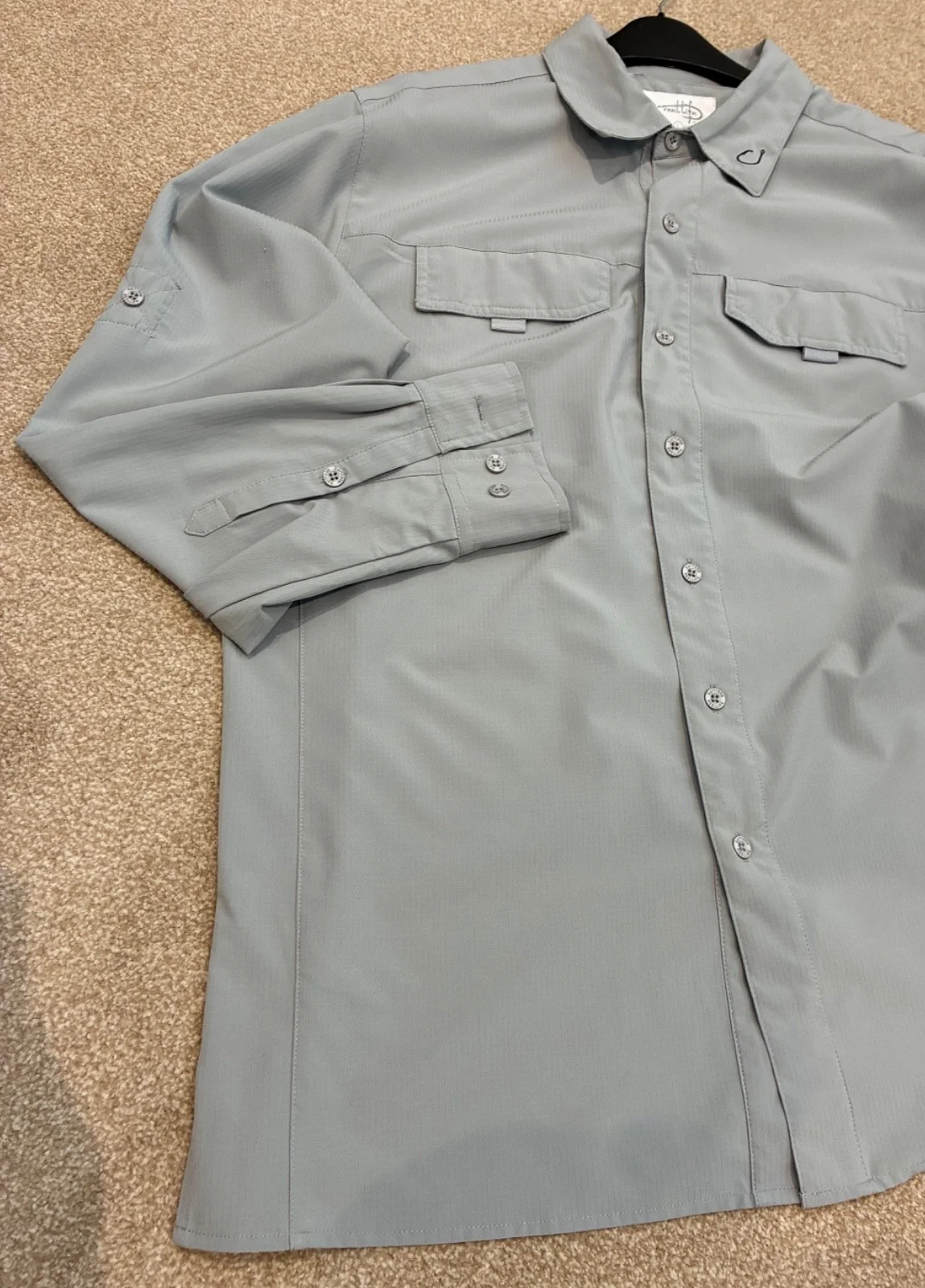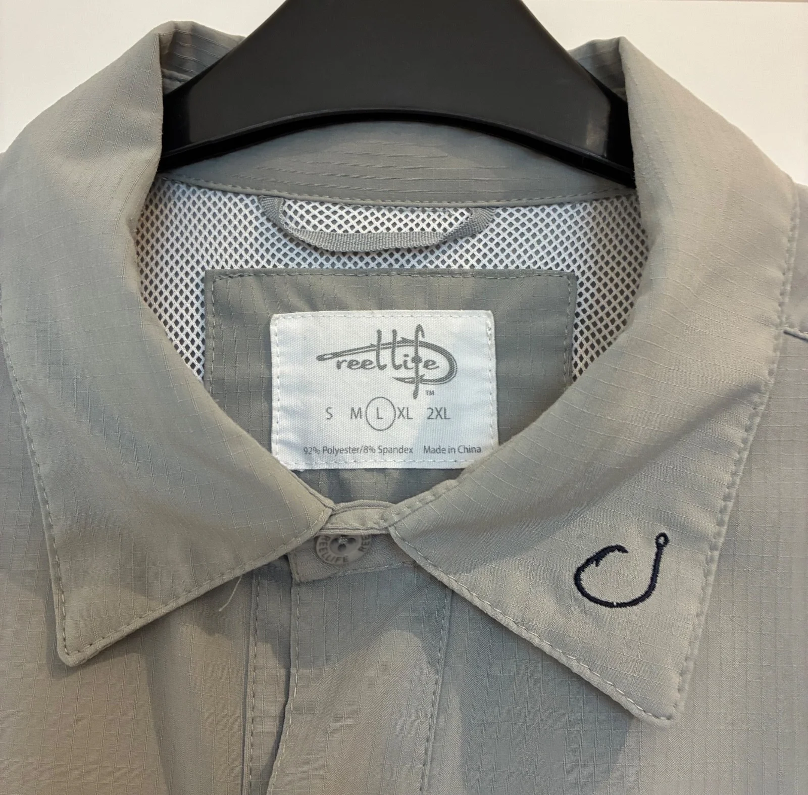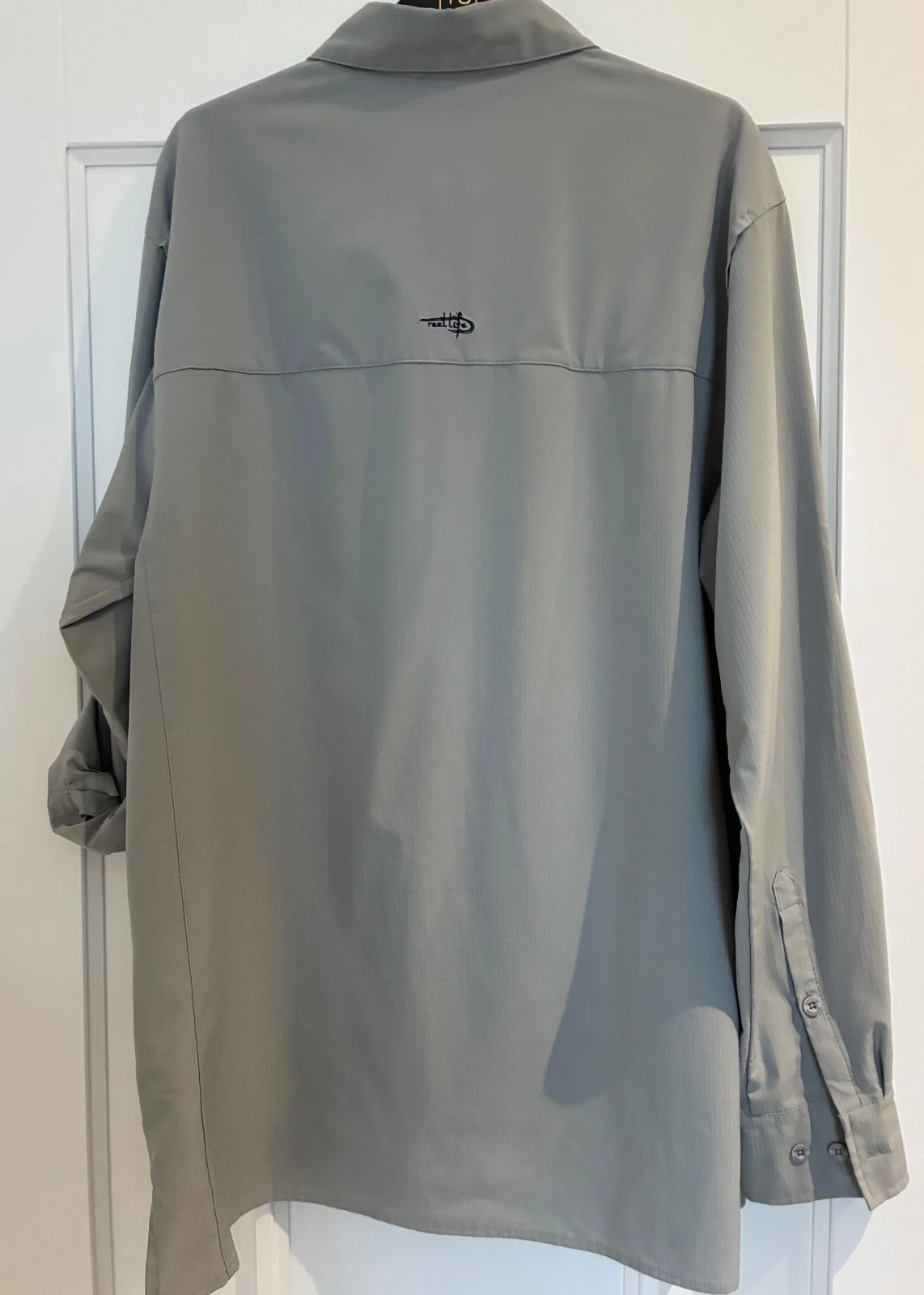 AMERICAN BRAND ‘REEL LIFE’ MEN’S FISHING SPORTS SHIRTORIGINAL RETAIL PRICE AROUND $70 IN LIGHTWEIGHT GREY FABRIC2 FRONT POCKETS & CONVERTIBLE SLEEVES WITH FASTENINGSSIZE LARGE - BACK LENGTH 31 1/2’’, CHEST WIDTH 23’’USED IN GOOD CONDITION FROM A SMOKE & PET FREE HOME