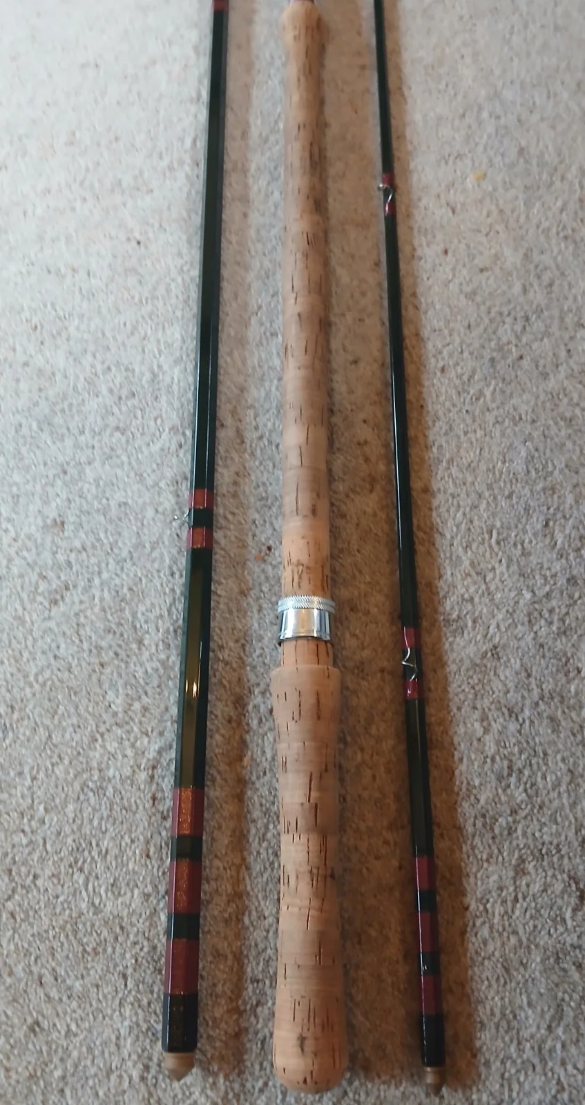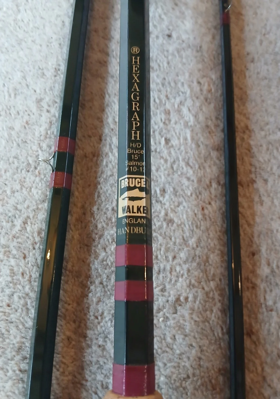 Bruce & Walker 'Bruce' H/D Hexagraph 15' 3-piece salmon rod #10-12 in excellent used conditionHopefully the photographs do this rod justice, it is in excellent condition and comes from the collection of a family friend. I don't belive this rod has been used since the late 1990'sAt this time this rod came out, Bruce & Walker were leading innovators in fly rod design in the UK and were pioneers in developing the use of graphite in rod building. The Hexagraph range were conceived to benefit form the lighter weight that graphite blanks offered, but using the hexagonal shape associated with split-cane rods in a innovative way to resolve the 'ovaling' of tubular blanks under stress; the hexagonal shape being stronger and less prone to distortion under load. A similar idea re-appeared more recently by Loop with the 7x range.The rod comes with makers red velvet bag and the all important section plus are present - as can be seen in the photographs. Please look at the photographs carefully, they should show the condition of the rod well, but if you need additional detail/pictures please do get in touch.Collection in or near Inverness welcome.