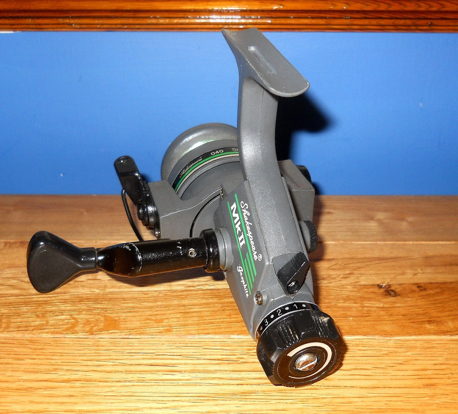 Shakespeare Mk II Fishing Spinning Reel.Colour grey. Left/right hand retrieve.Rear drag adjuster. Loaded with light line.On/off lock. Folding handle. Superb condition.Cleaned, lubricated & ready to go fishing!! Any further questions please ask.