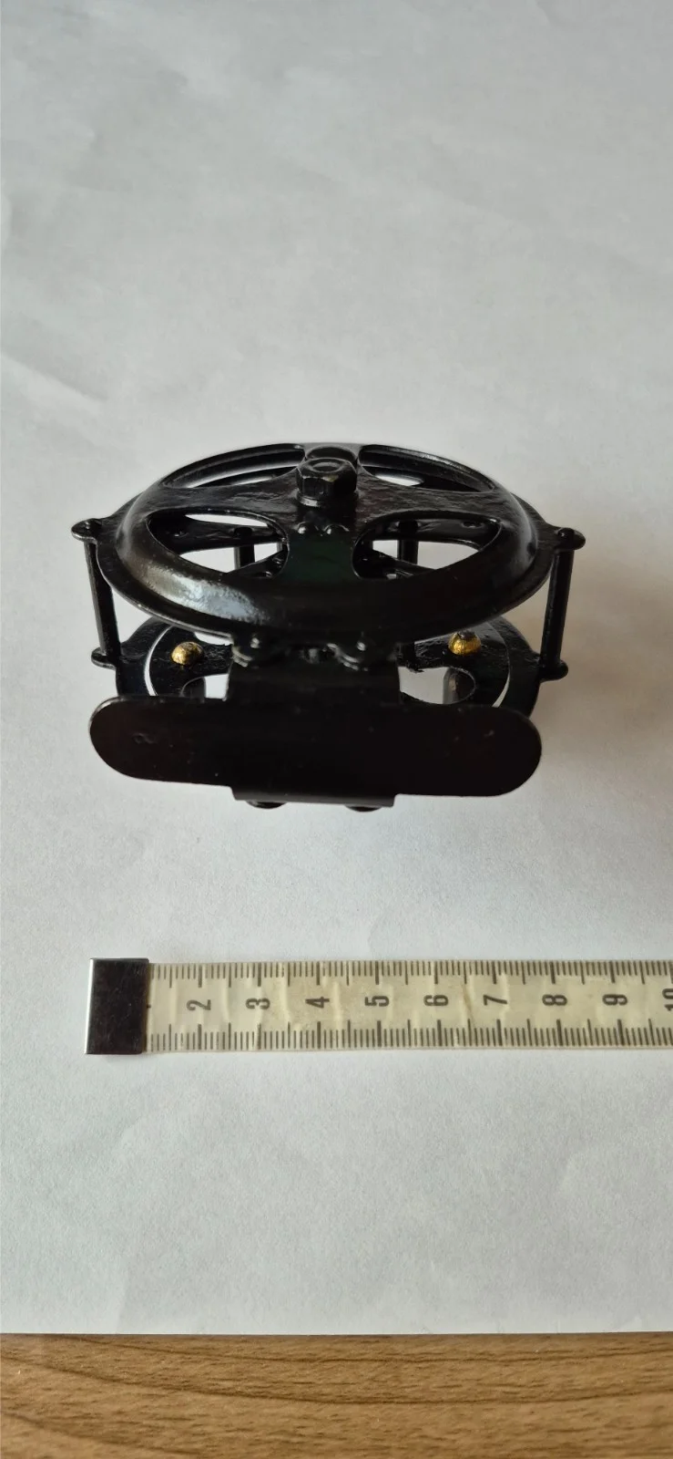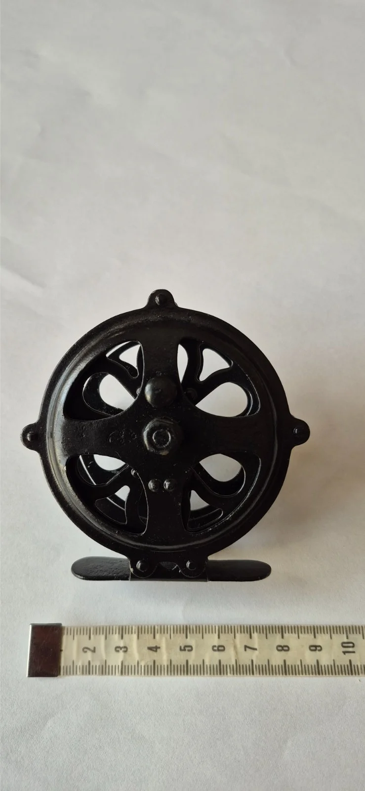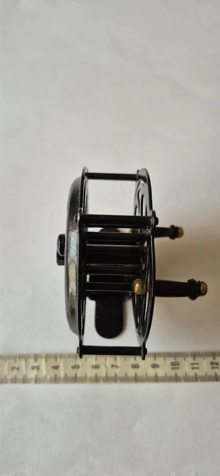 The item pictured is a vintage Pflueger Sal-Trout No. 1554 fly fishing reel. It was manufactured by Pflueger, a well-known name in fishing tackle. The model was produced from approximately 1915 until the 1950s. It is a single-action reel, often used for light river trout or grayling fishing. The reel is made in the USA and features a black finish with a skeletonized design. 8cm x 3cm spool