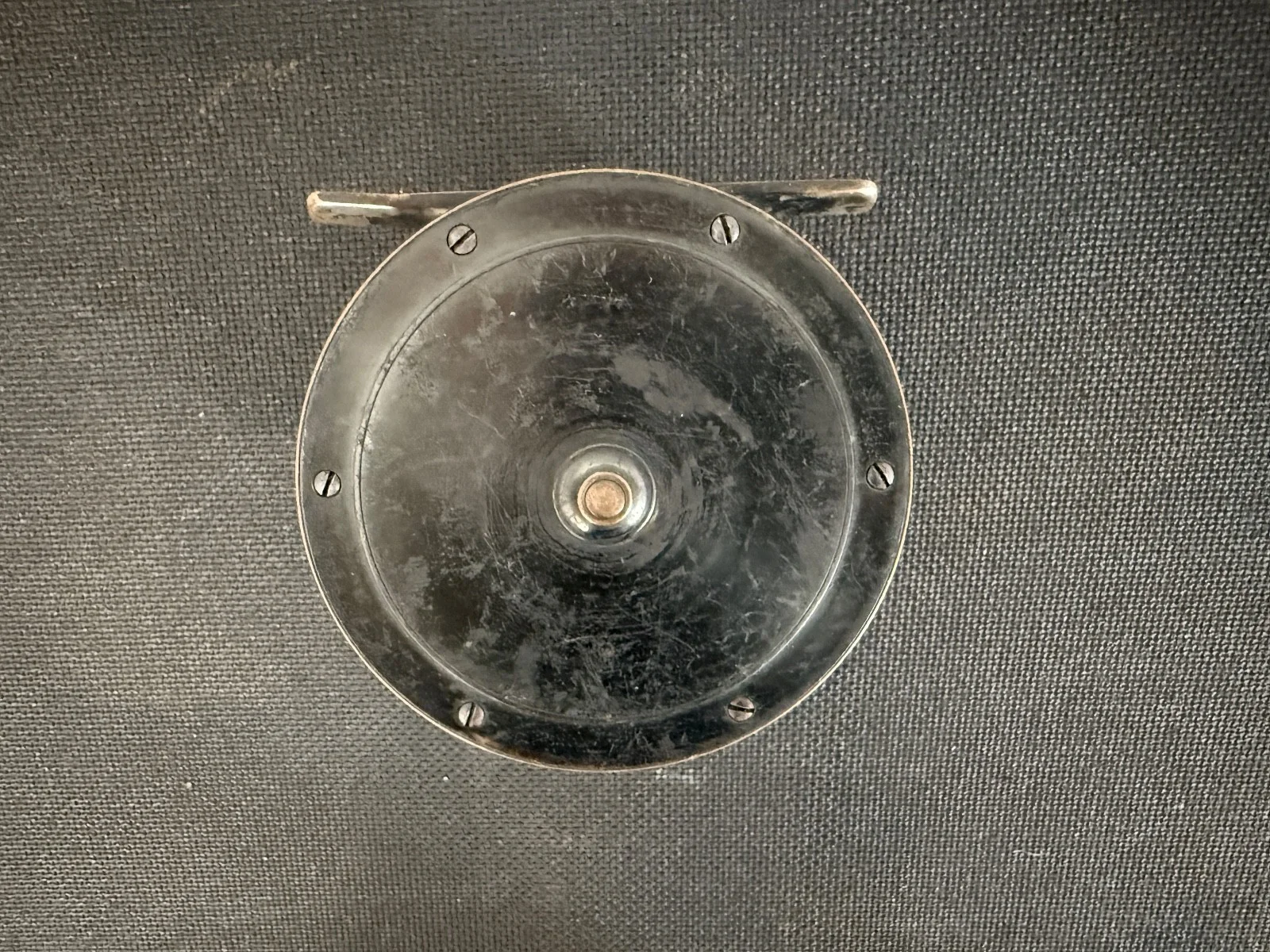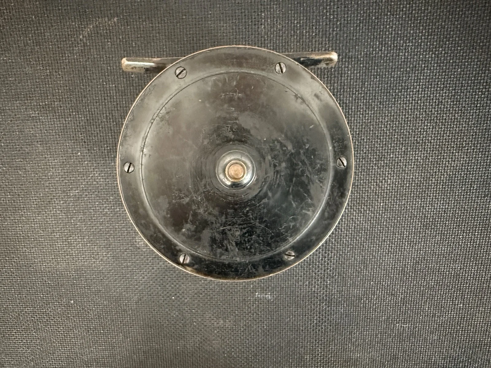 A classic vintage black finish fly reel, measuring approximately 3 3/4 inches in diameter, typical of British-made reels produced by makers such as Allcock or J.W. Young in the early to mid-20th century.A simple and robust design, with a smooth uncluttered back plate and traditional construction, making it both a practical fishing reel and an attractive collectible piece.Details:Type: Fly reelSize: Approx. 3 3/4" diameterMaker: W.Garden AberdeenEra: Early–mid 20th centuryFinish: Black enamelCondition:In good vintage condition with general wear consistent with age and use.The reel shows surface wear and marking to the finish. It appears complete and in working order. Please study photos carefully for full condition.Notes:A good honest example of a traditional British trout reel — ideal for use or as part of a collection.