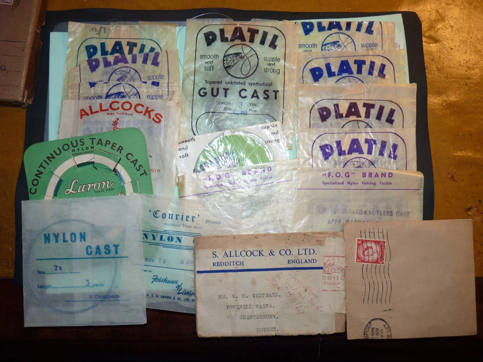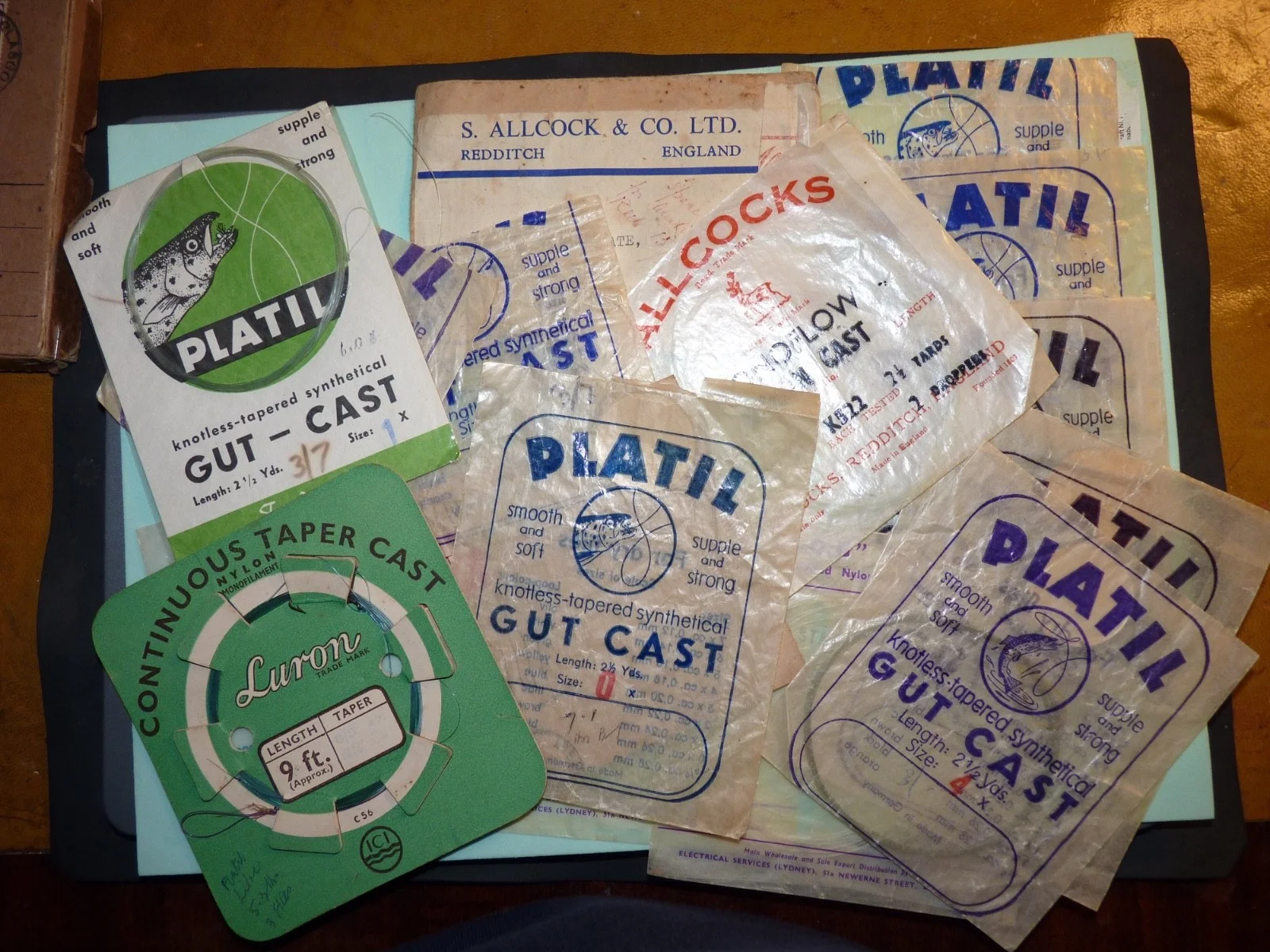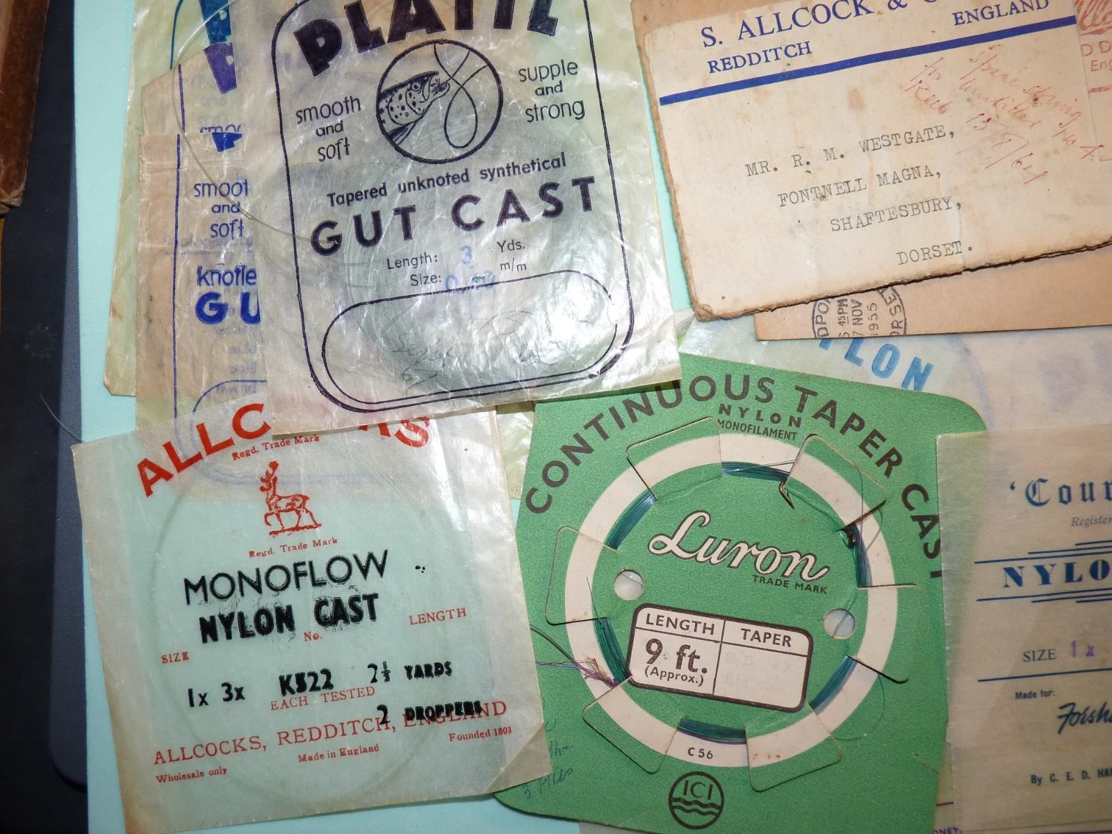 Vintage fishing, Alex Martin card box and gut casts/packets.