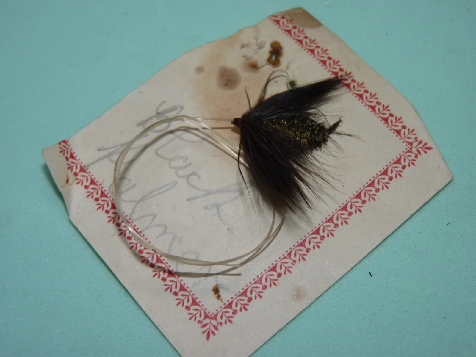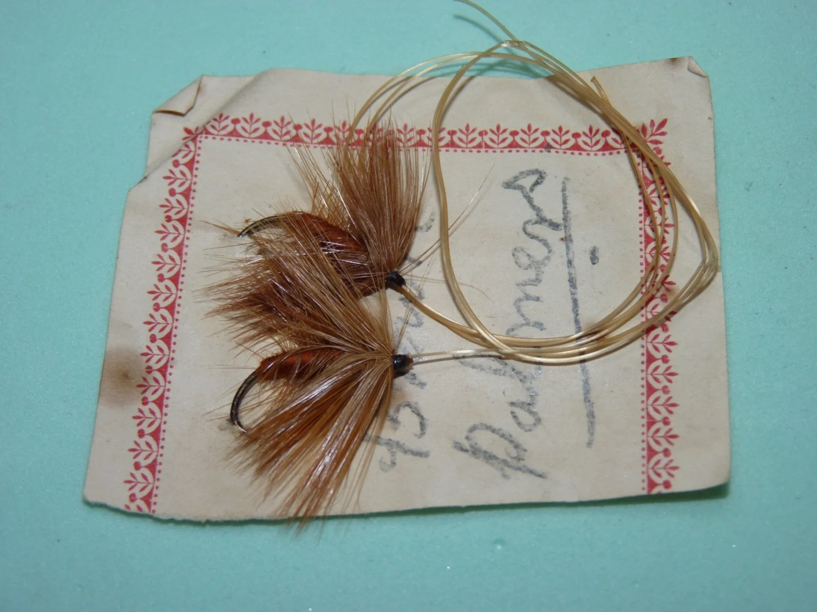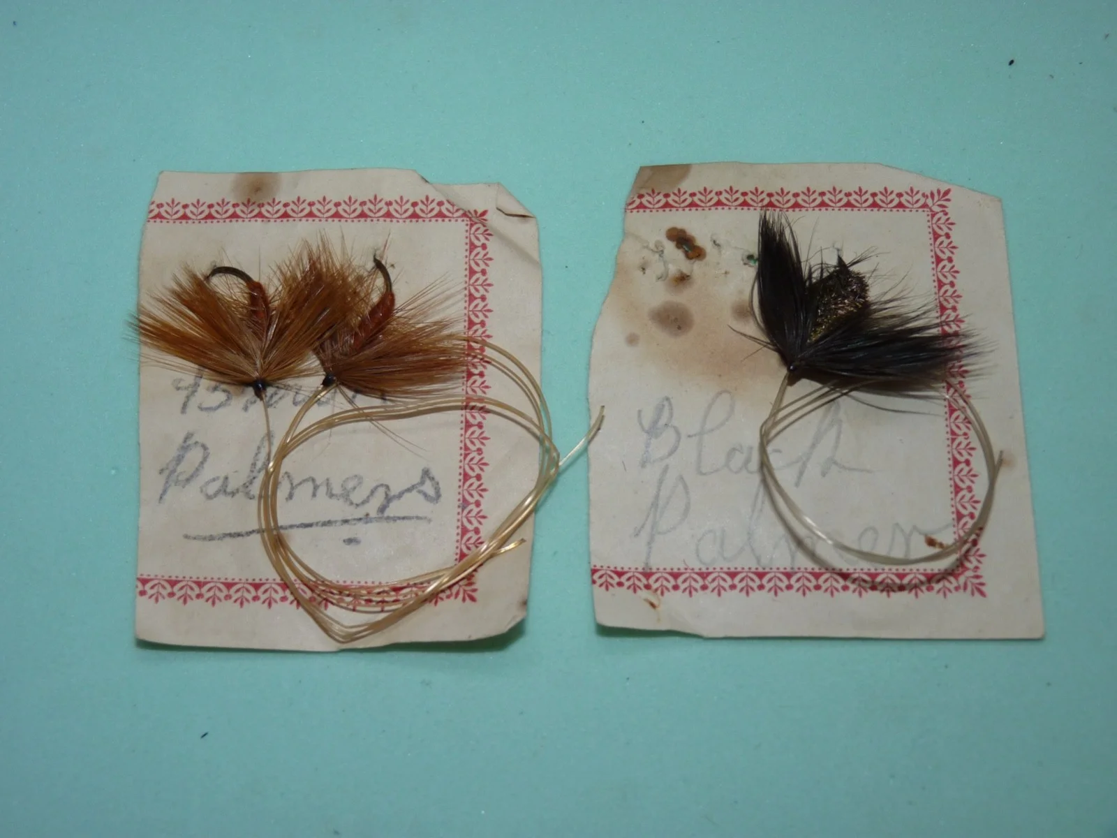 3 Vintage gut tied salmon / trout fishing flies attached to gut casts, named on slips of paper.Brown palmer x 2.Black palmer x1. all about size 8s.3 x gut tied flies.
