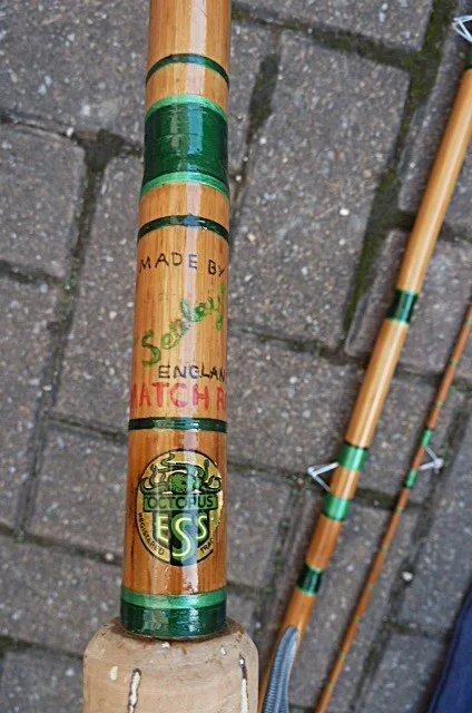For auction is an "Edgar Sealey" "Octopus ESS" "Match Rod" approx 13 ft in lenght. Logos clear and readable.A vintage rod and a true survivor!It has been restored at some stage with the original tip and butt agatine? insert rings and new high bell intermediates. Whipped in two shades of green, there is slight leaking of the varnish finish in a couple of places.I believe it to be made from "Spanish Reed" butt, and middle which has a spliced split section. and a split cane tip.It is in good condition and comes with a non original blue bag. The cork handle has alloy sliding reel fittings and measures approx 25 1/2 inch. It weighs approx 14 1/4 ounces. It has the original alloy ferrule stops. Good ferrules.There is a slight set, or deviation to one side which i have attempted to photograph. Have a look at all the photos as they are part of the description.One to use or to add to your ever increasing collection.Postage by Parcelforce @ £13.63 Will be Posted in a sturdy tube.Paypal only.Postage ONLY within the UK and with a UK postcode