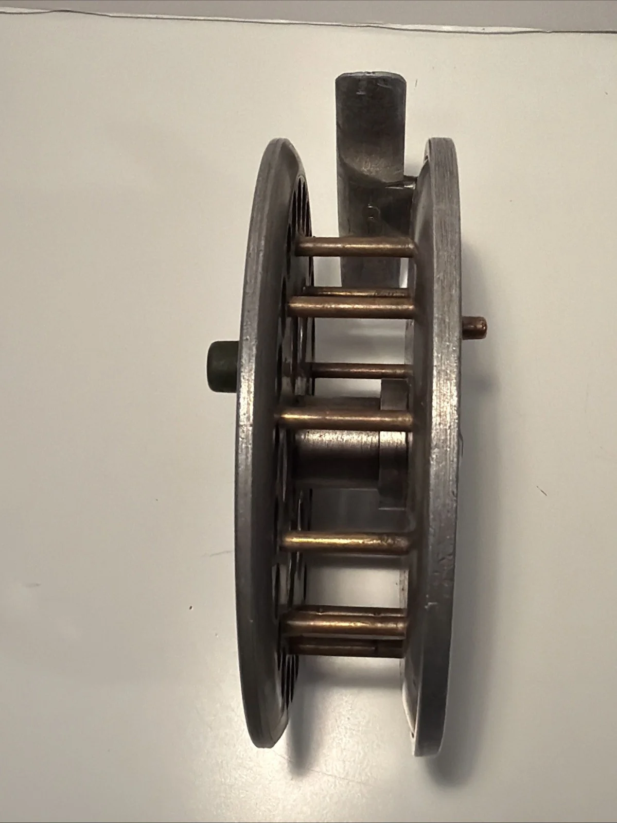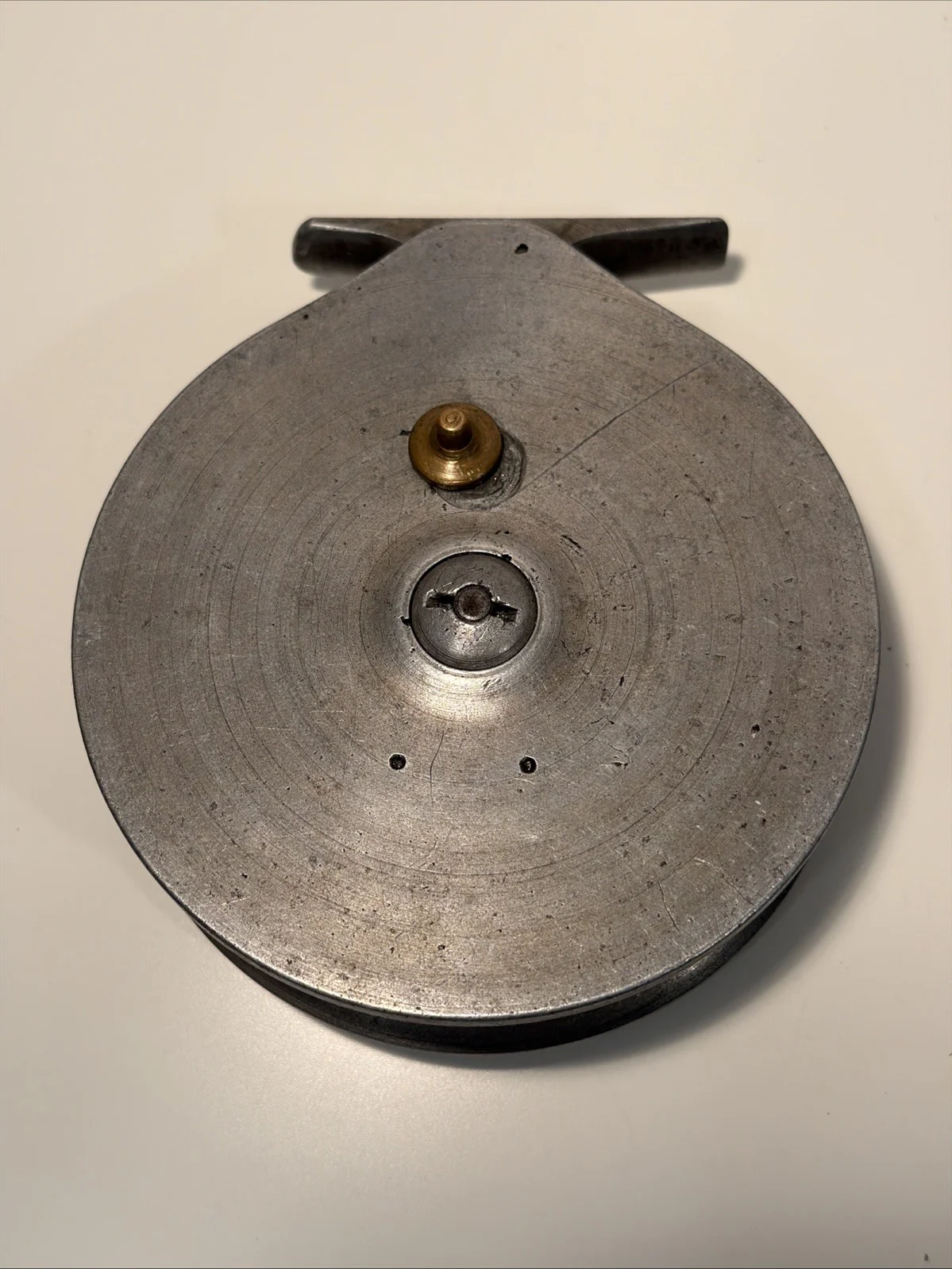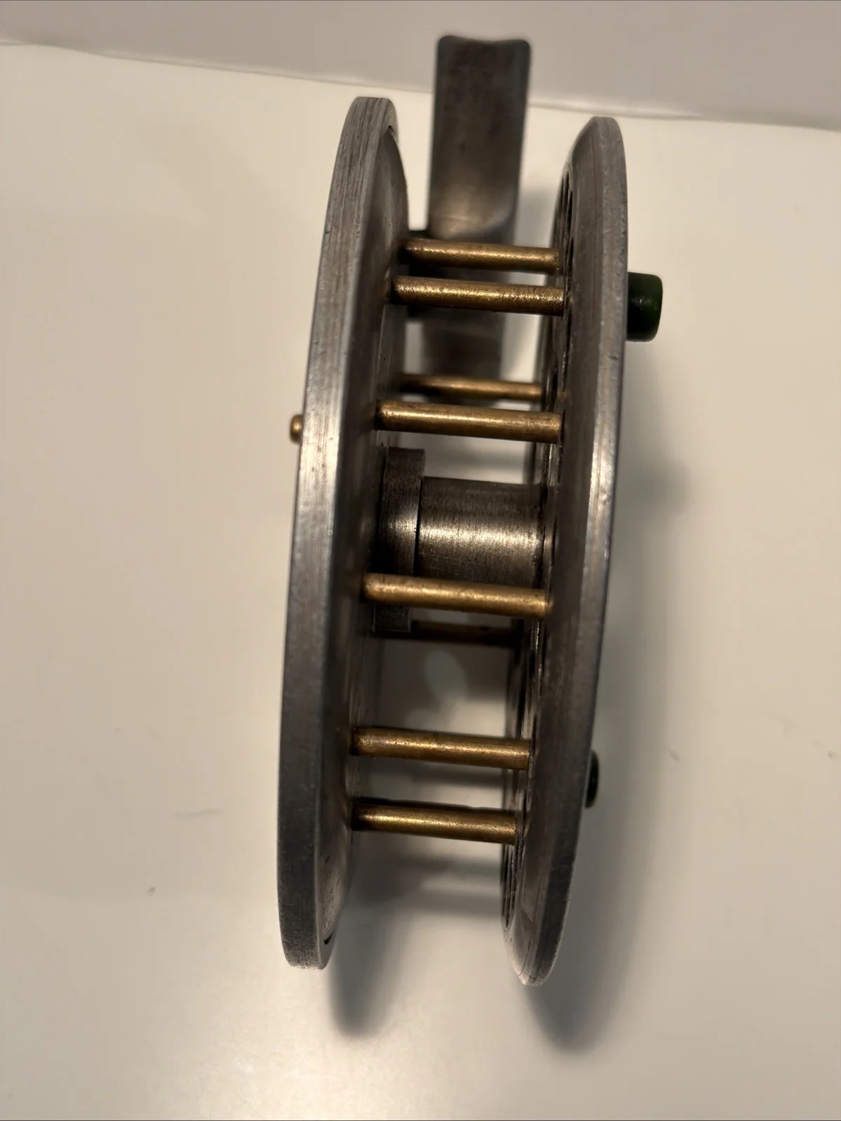 Harry Reynolds 4.75” centrepin reel with tarnished alloy finish, original dark green small handles, on/off check. 76mm straight alloy foot. Spins very well.