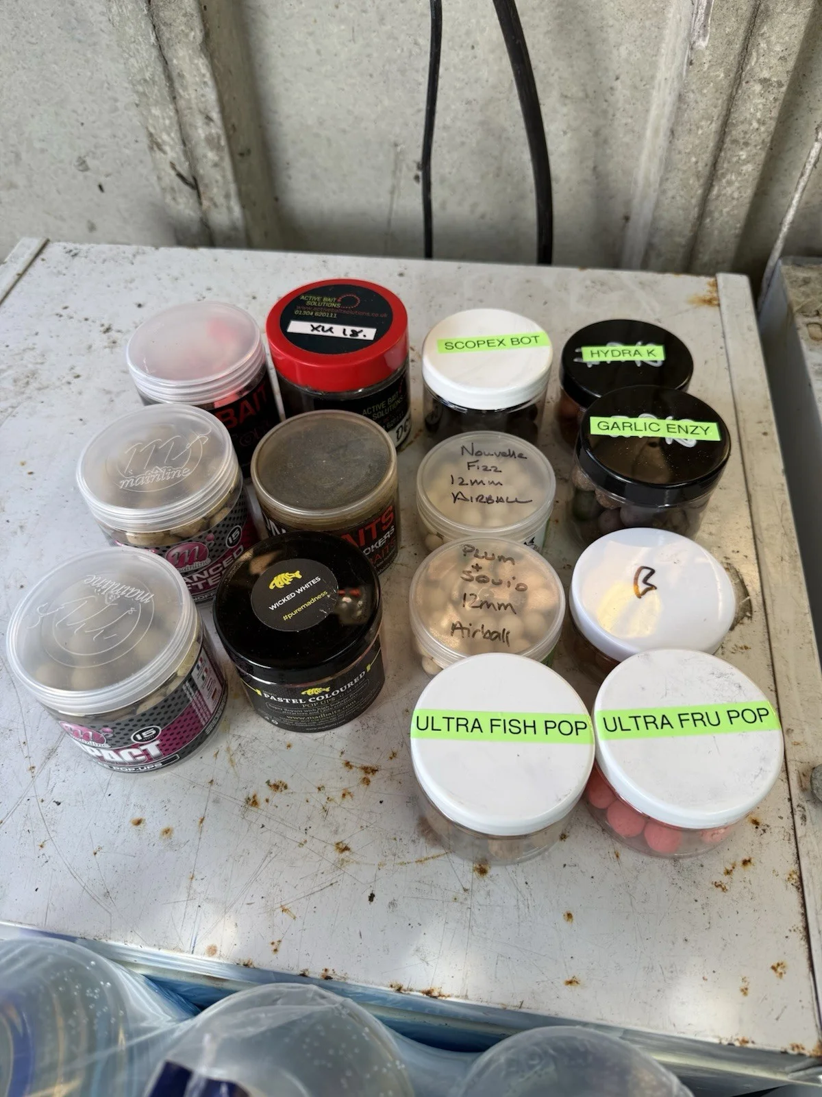 14 pots of various hookbaits. Pop ups, wafters and bottom baitsSome pots are mixed pop ups and waftersSome are new some are usedHave Mainline banoffee pop ups and wafters that are new. Nash Scooex Squid cultured bottom baits, few pots of UB Baits pop ups, ABS Hydra K mixed pot of pop ups and wafters same with the Garlic Enzyme, mixed pot of DNA The Bug wafters match the hatch round and fluoro dumbells, DNA crayfish dumbells mixed sizes. And some other pots from other brands