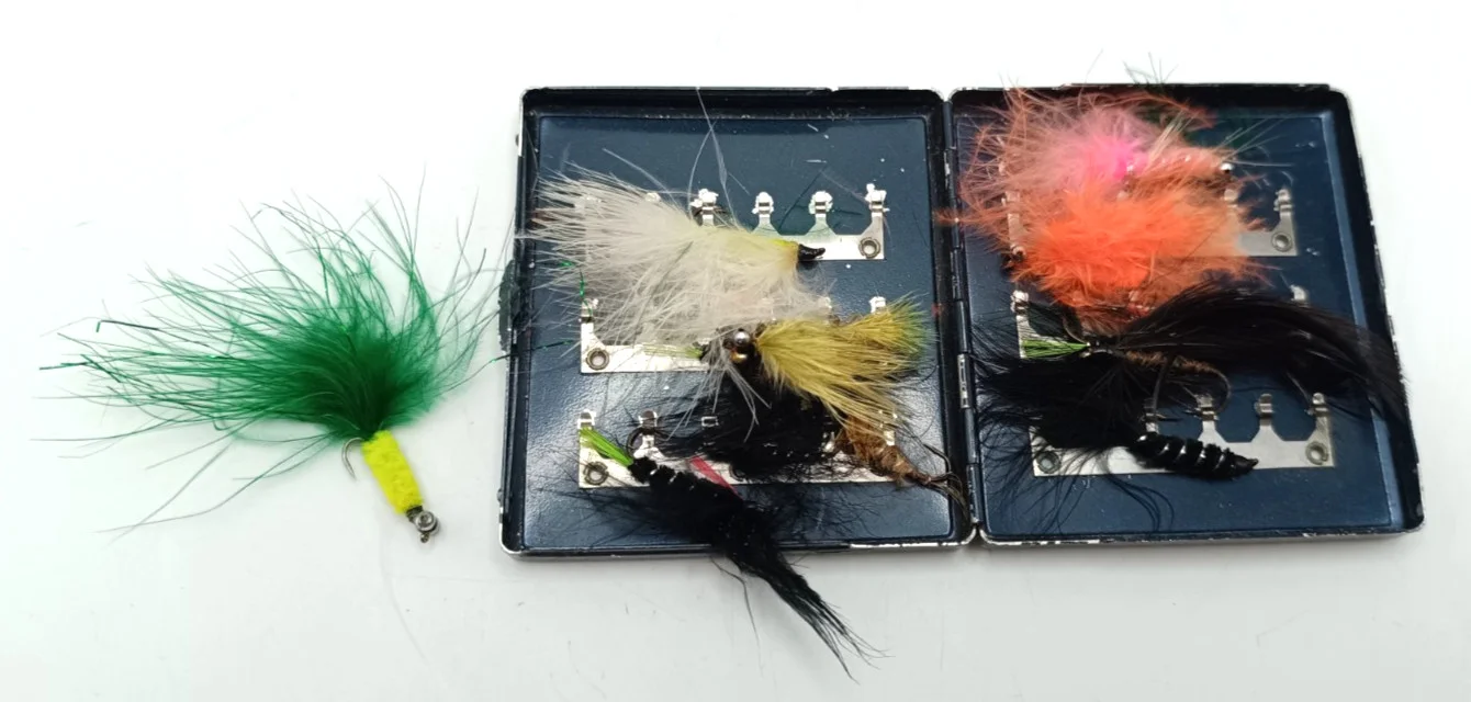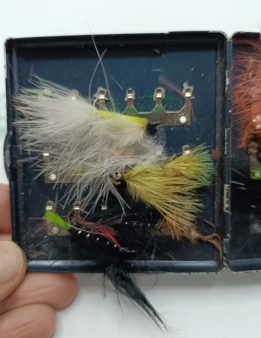 USED VINTAGE CONDITIONSCRATCHES IN COATINGFEW OLD HAND MADE FLIES INSIDE