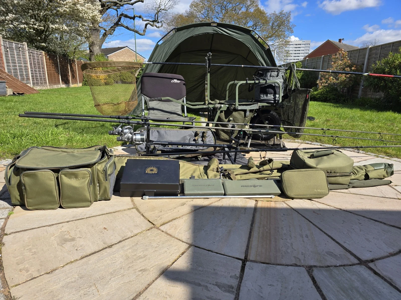 Job lot of used carp fishing tackle for sale, ideal for beginer.Prestige carp porter mk2 barrow, small wheel rub where forks werent set right.Fox stalker plus + rod podKorum day shelter lite mk2Trakker rod holdhallTrakker XL carryallTrakker NXG XL pva pouchTrakker buzz bar pouch2 x Nash s5 siren bite indicators2 x Shimano super bait runners aero 10000 XTE2 x Daiwa black widows G50 12' 3Lb1 x Daiwa Vulcan S c2234 12' 2 3/4 LbWychwood scalesDiem weight slingKorda rig safeKorda tackle safeDaiwa tackle boxCrane foldable chairShakespeare omni tele 3m landing net handleDinsmore landing netlittle side tablePrologic colapsible bagloose tackle shown included float, leads, rigs, pva, etcThanks for looking, due to size & weight of items this is collection only from B36 0hl Birmingham.No cash on collection thankyou.