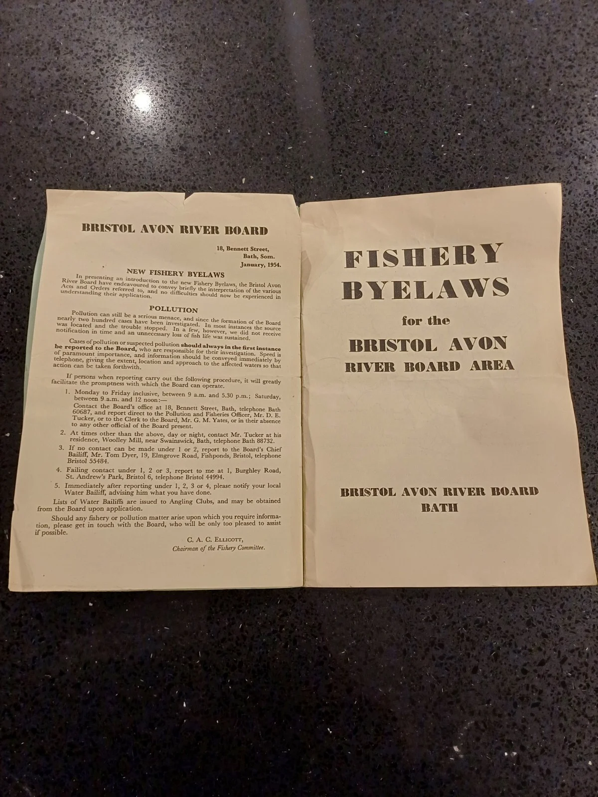 BRISTOL AVON RIVER BOARD. FISHERY BYELAWS booklet 1954. About 12 pages plus one loose insert page. Not flat and some creases, dog ears, been folded before, odd small tear. Pages are quite clear and readable for 71 years old. Printed in Bath. UK post.