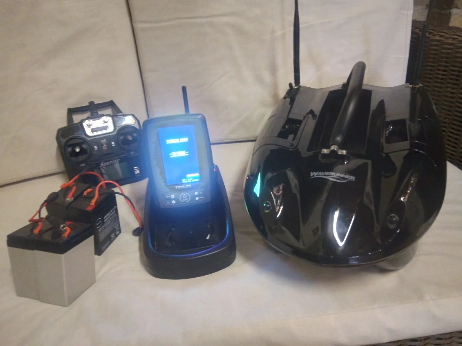waverunner shuttle bait boat with toslon tf 500 & solar panel.3 sets of batteriesrechargeable batteries for handsetrechargeable batteries for toslonboat bag.collection only fromRM13 9SL