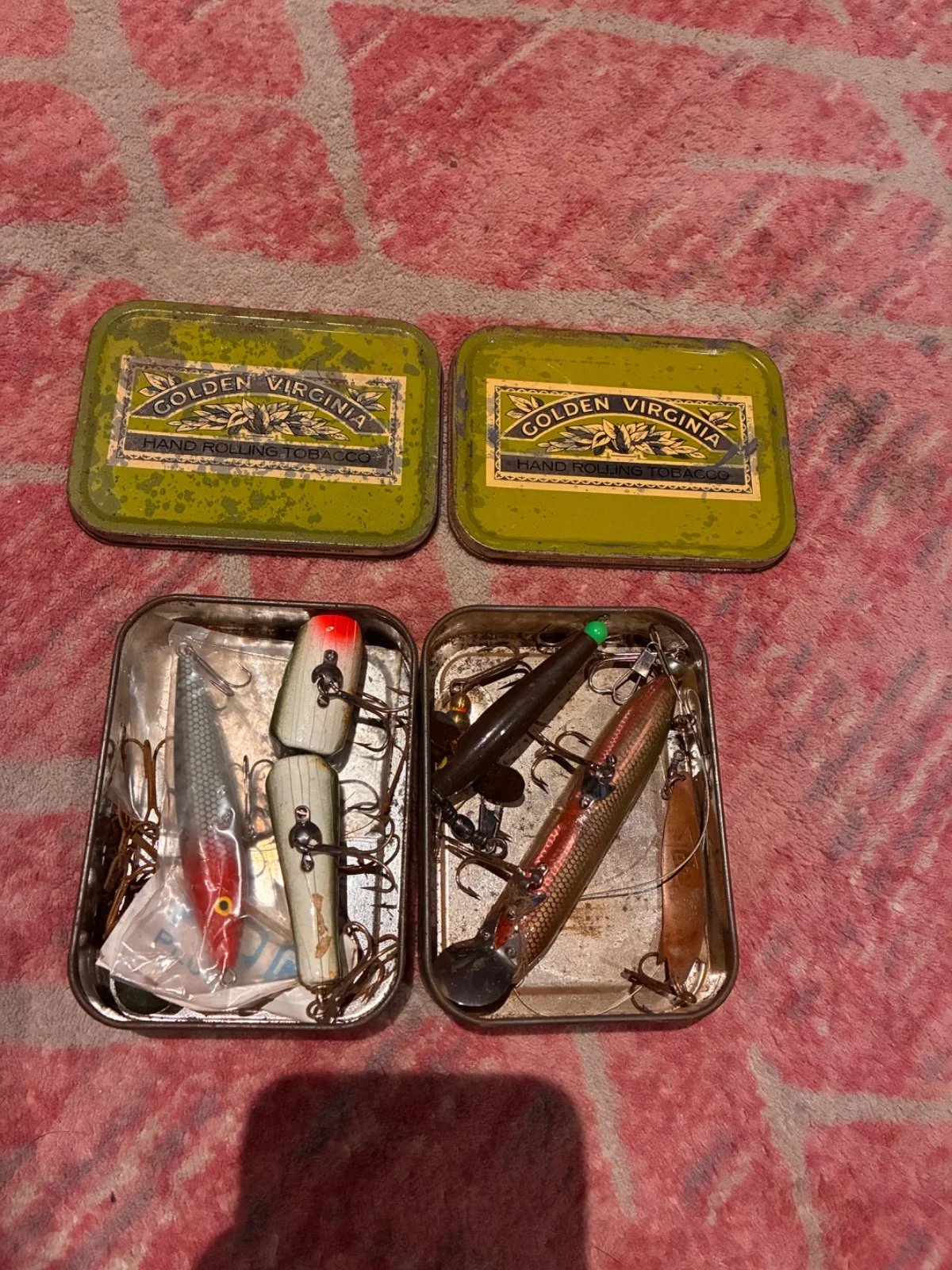 A fantastic "shed find" selection of vintage fishing tackle and memorabilia. Perfect for a collector, a restorer, or as rustic man-cave decor.This lot includes a mix of classic lures and vintage storage tins, all showing authentic age and character.What’s Included:• 2x Vintage Golden Virginia Tobacco Tins: Classic green hinge-lid tins. These have a lovely aged patina and are perfect for storing small tackle or bits and bobs.• 1x PDQ Plus Bait: Still in its original vintage plastic packaging with the original price tag. A great "New Old Stock" (NOS) piece.• 1x Large Jointed Pike Plug: A classic green/yellow perch pattern lure with multiple treble hooks.• 1x Large Crankbait/Plug: Deep-bodied lure with a red head and silver/green body.• Assorted Metal Lures: Includes a copper-tone spoon and a traditional spinner.• Misc Tackle: A selection of loose hooks, a small float, and some wire traces.Condition:These items are sold as seen in "found" condition. There is visible surface rust on the hooks and metal components, and some wear/scuffing to the paint on the lures and the tins. I have not attempted to clean these to preserve their original vintage look. Please study the photos carefully for a better idea of the condition.
