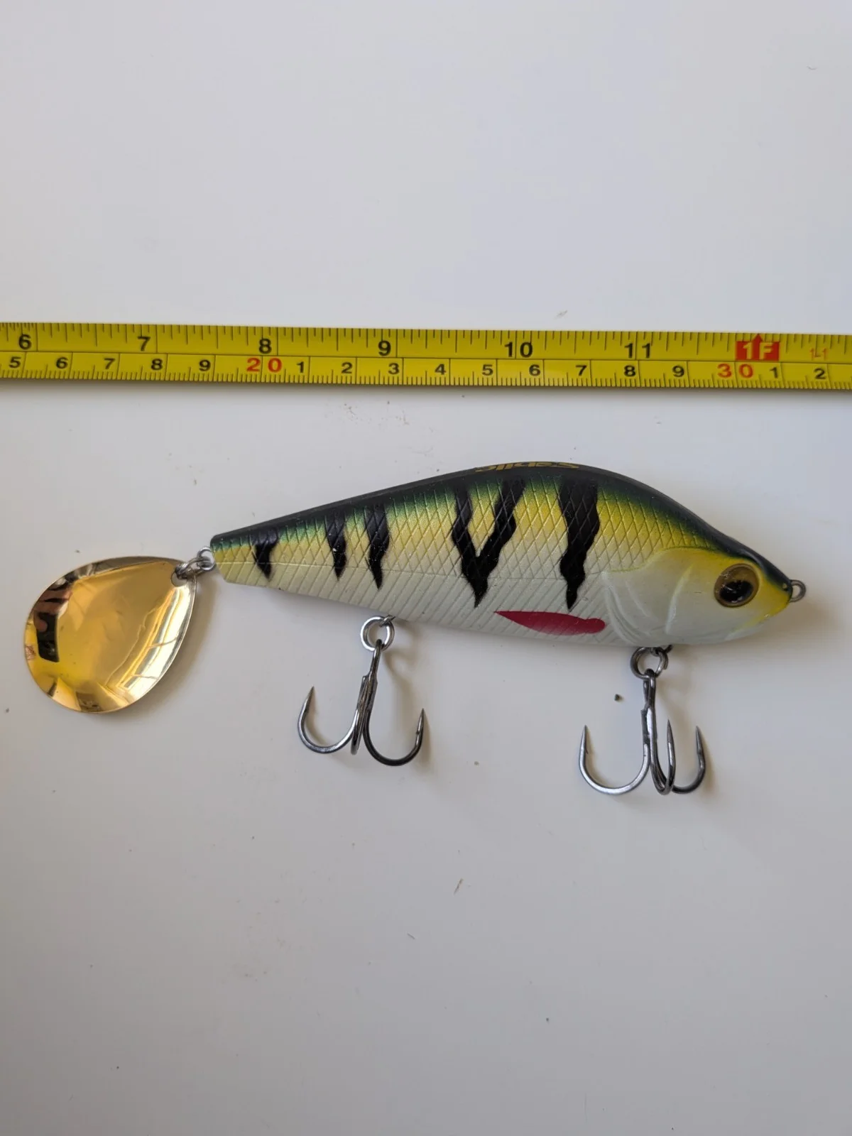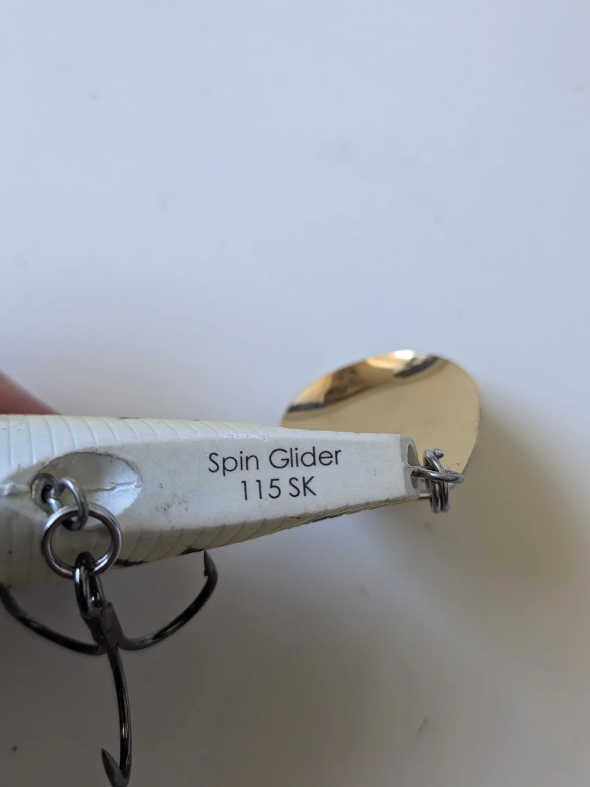 Barely used, only very minor marks.The Sebile Spin Glider 115 SK (Sinking) is a versatile 115mm hard bait weighing 65g.Combines a swimming glider action with the flash and vibration of a spinner blade.Can be used between 0.5m - 4m depth depending on retrieve speed.