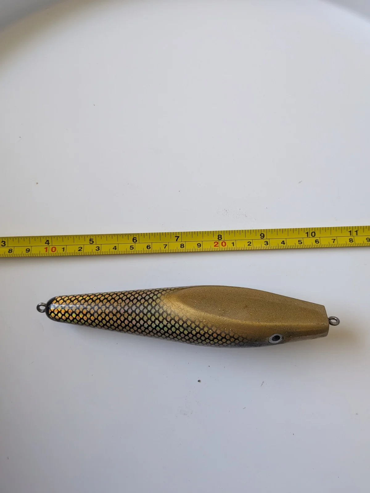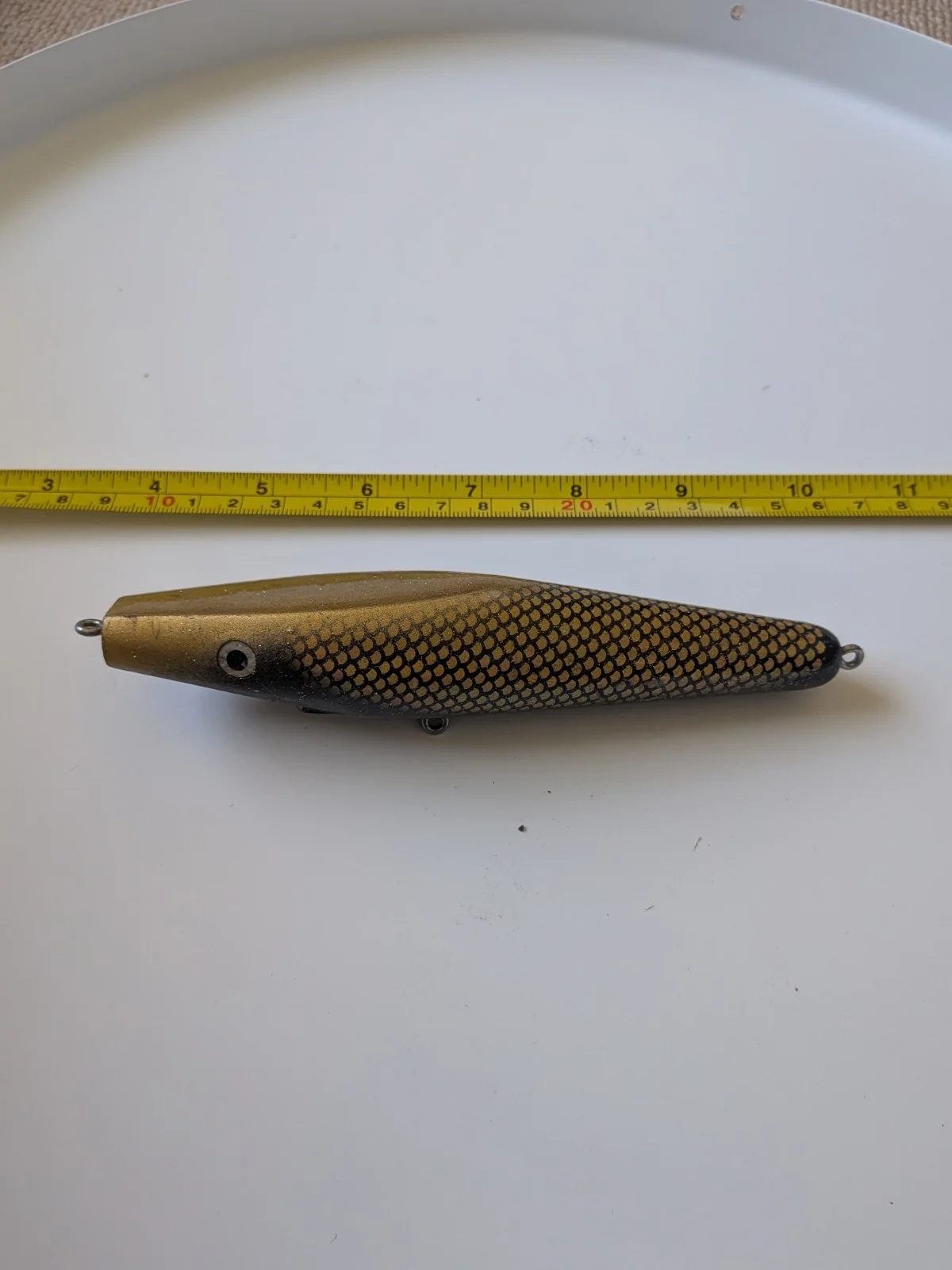 Odyssey Lures - The Pig Jr (15cm)Colour: Gold MularSolid topwater/crankbait lure that pushes so much water. These are now becoming a bit of a collectible item.This one's been used and shows a bit of hook/teeth rash (see photos), but there's loads of life left in it. New hooks will be needed. 71g without hooks.
