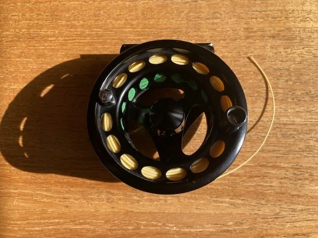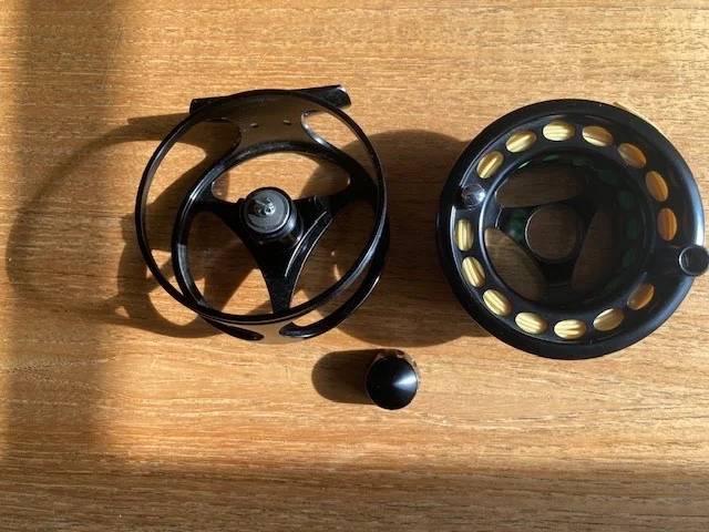 A little-used Danielsson fly reel in as-new condition with a maker-unknown floating DT fly line and backing. Designed for lines from 2 to 6 wt. RHW. Complete with a neoprene pouch, adjustment key, instruction manual and Danielsson box.