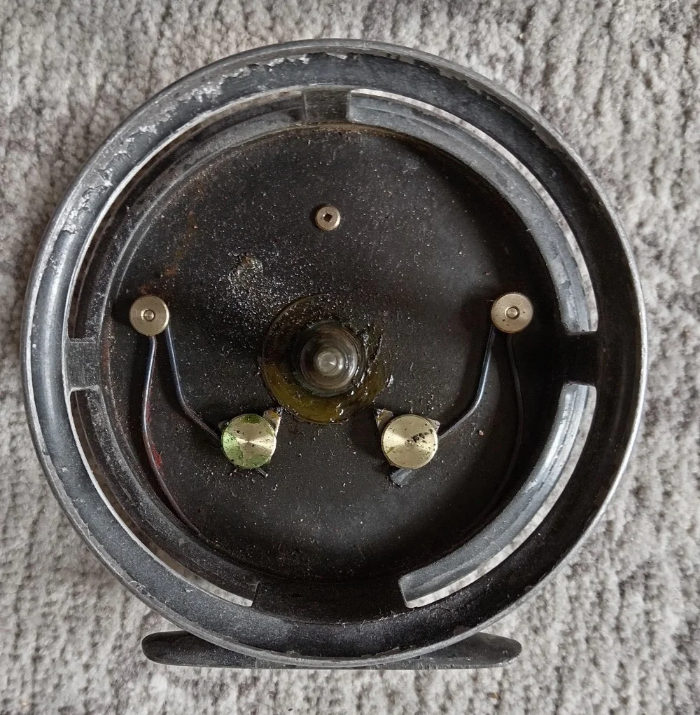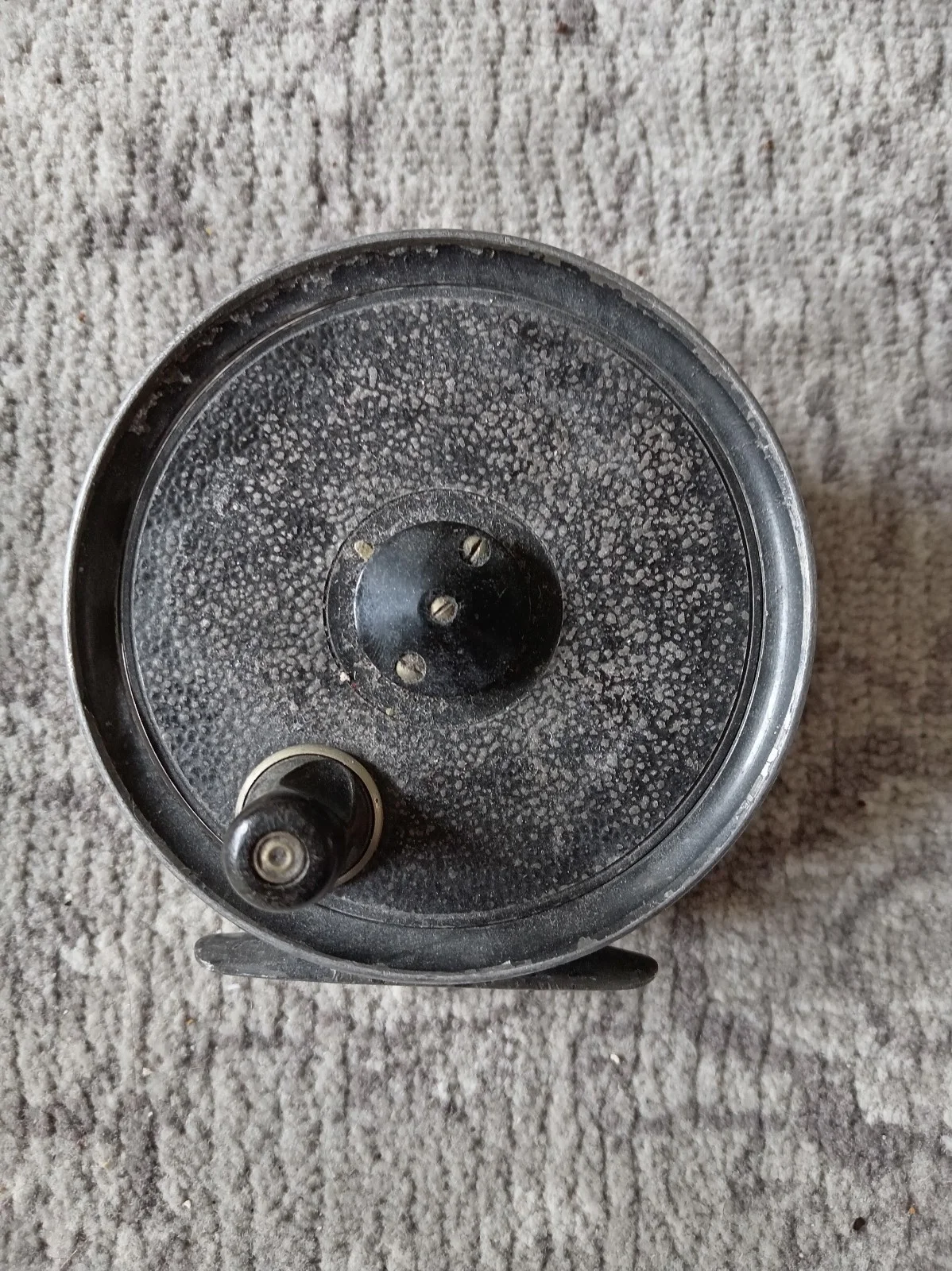Reel has surface wear, but is operational and has a fly line in good condition included (unknown type of line). Size is approx 11 x 4 cm.
