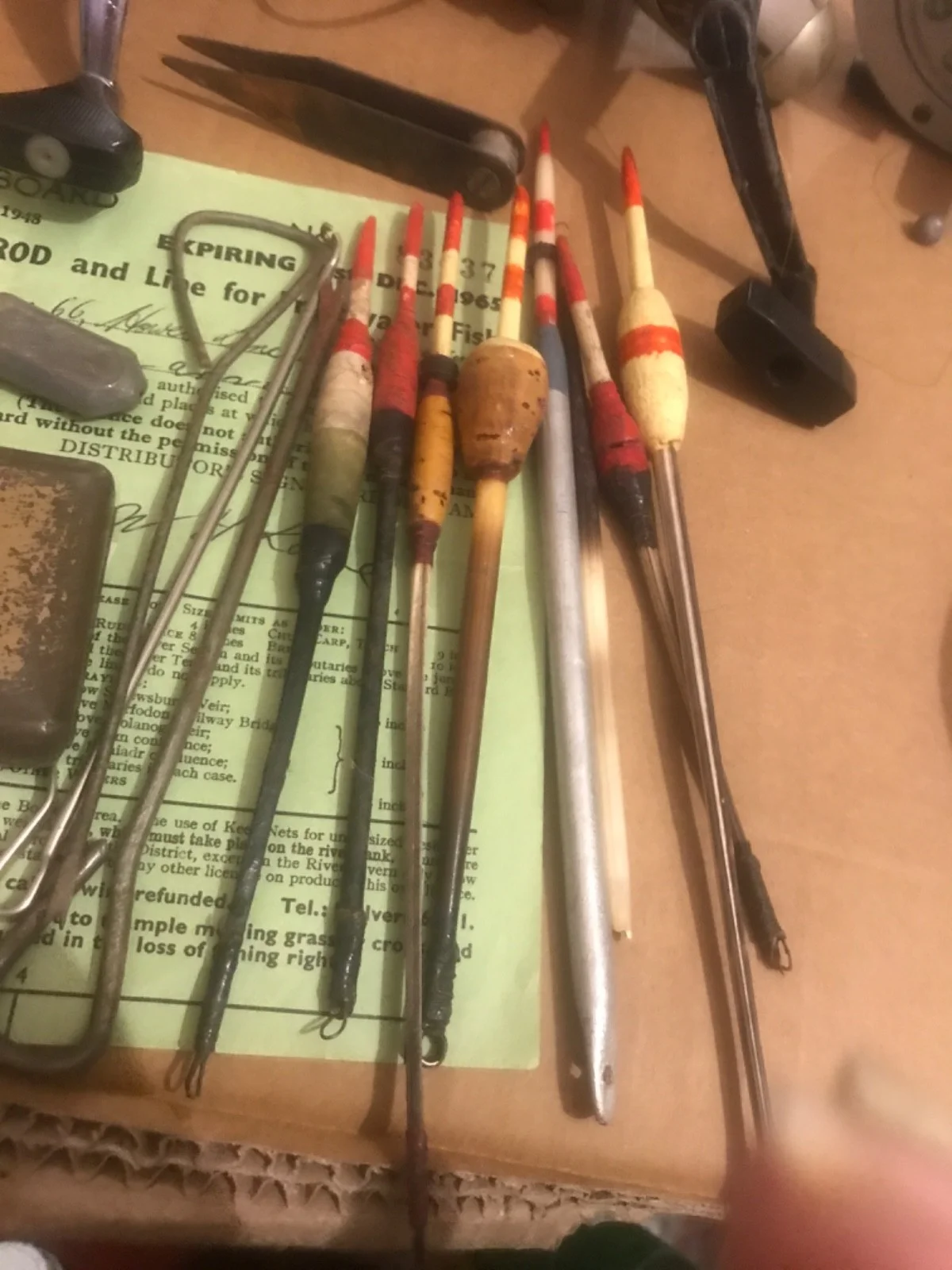 A nice mixed lot including two generations of Intepid De Luxe fixed spool fishing reels and a MAP 22 fly fishing reel all in good condition and fully functional, there are also 20+ small flys, a 1965 Severn river authority fishing license price 5/-,7 cork on quill floats, 3 metal disgorgers also a few hooks an aluminium bait can and more please look at the photos to be sure of what your getting