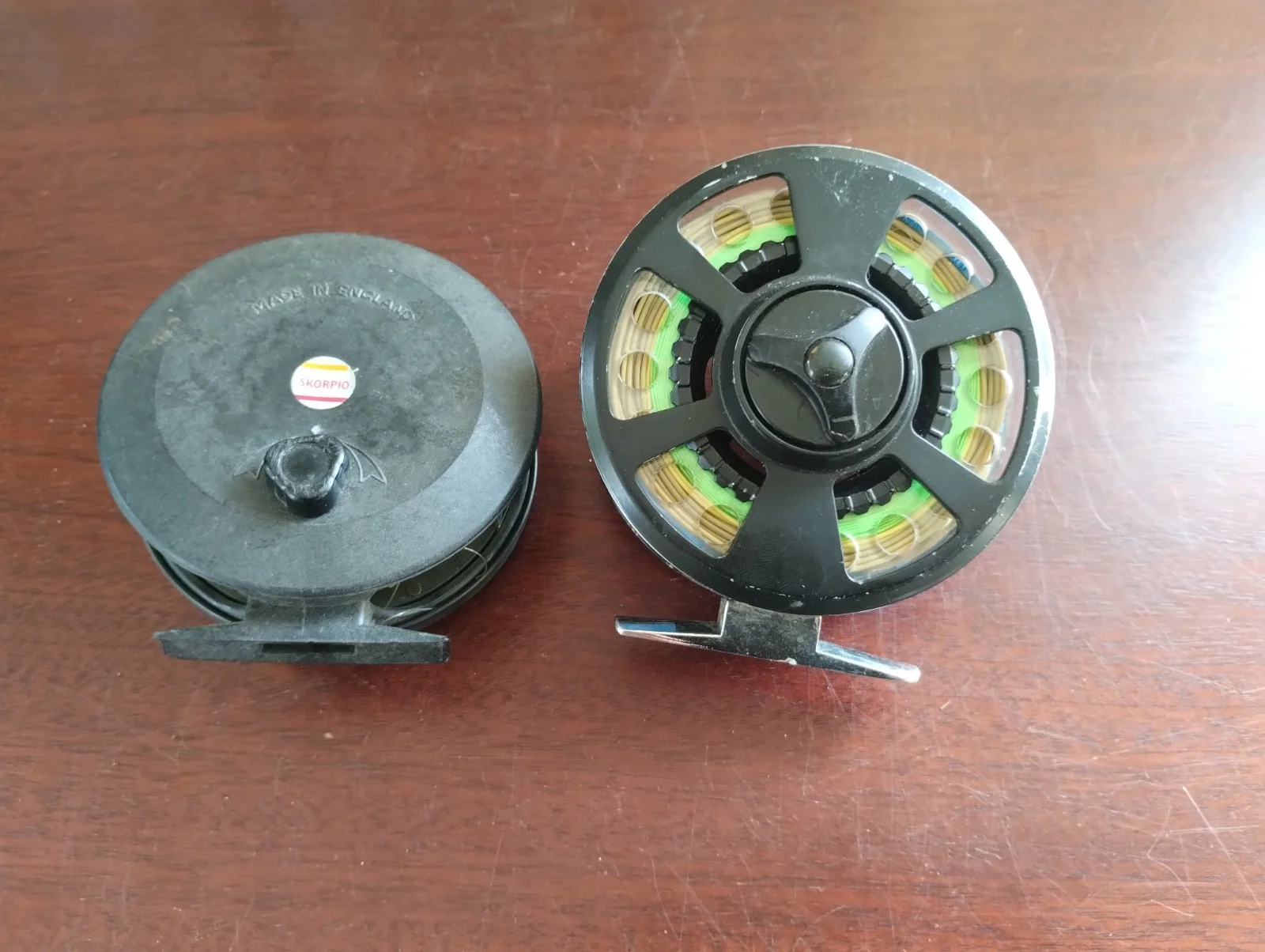 2 X VINTAGE FLY FISHING REELS 1 IS A SKORPIO AND THE OTHER ONE DONT KNOW MAKE.