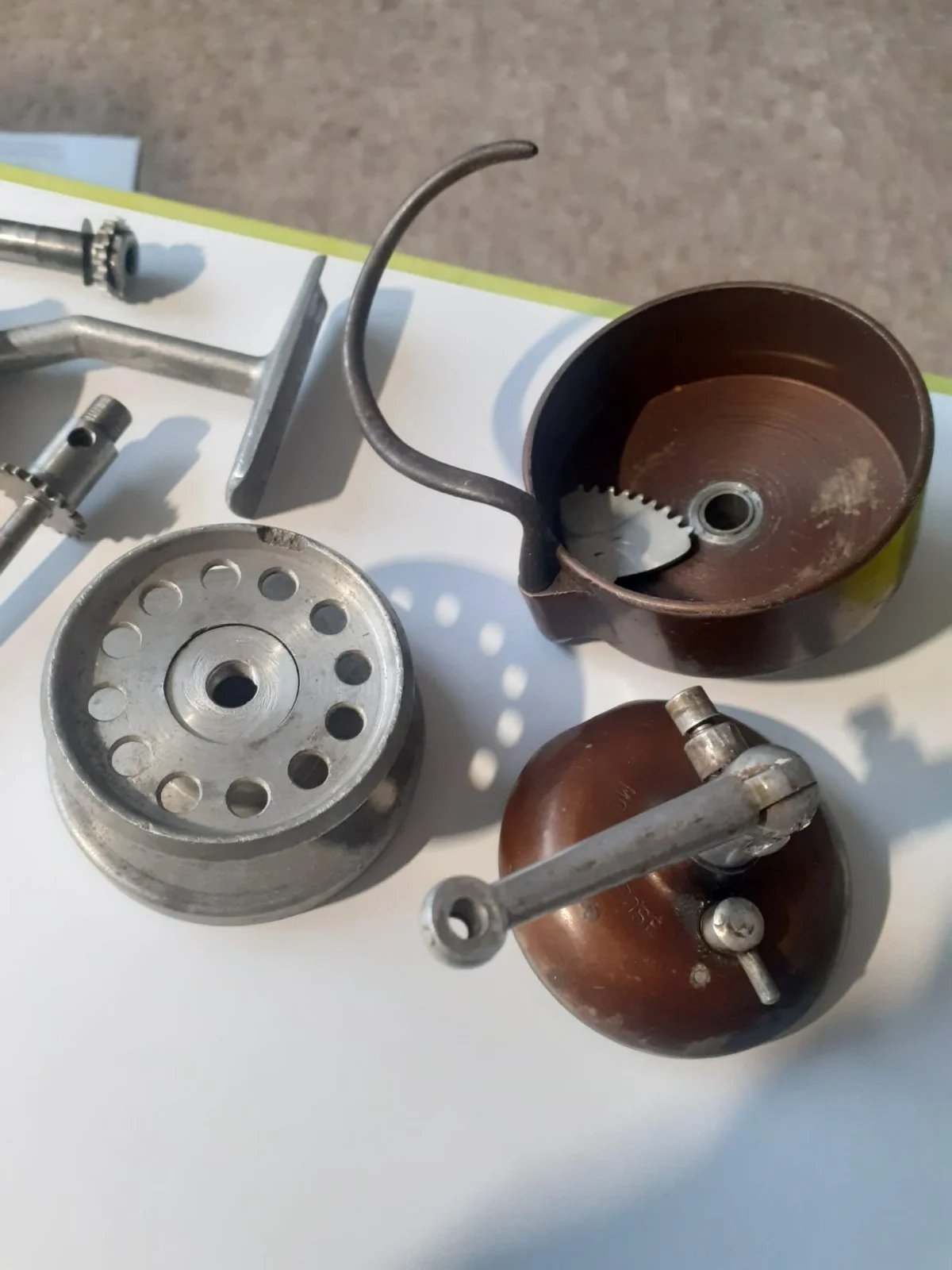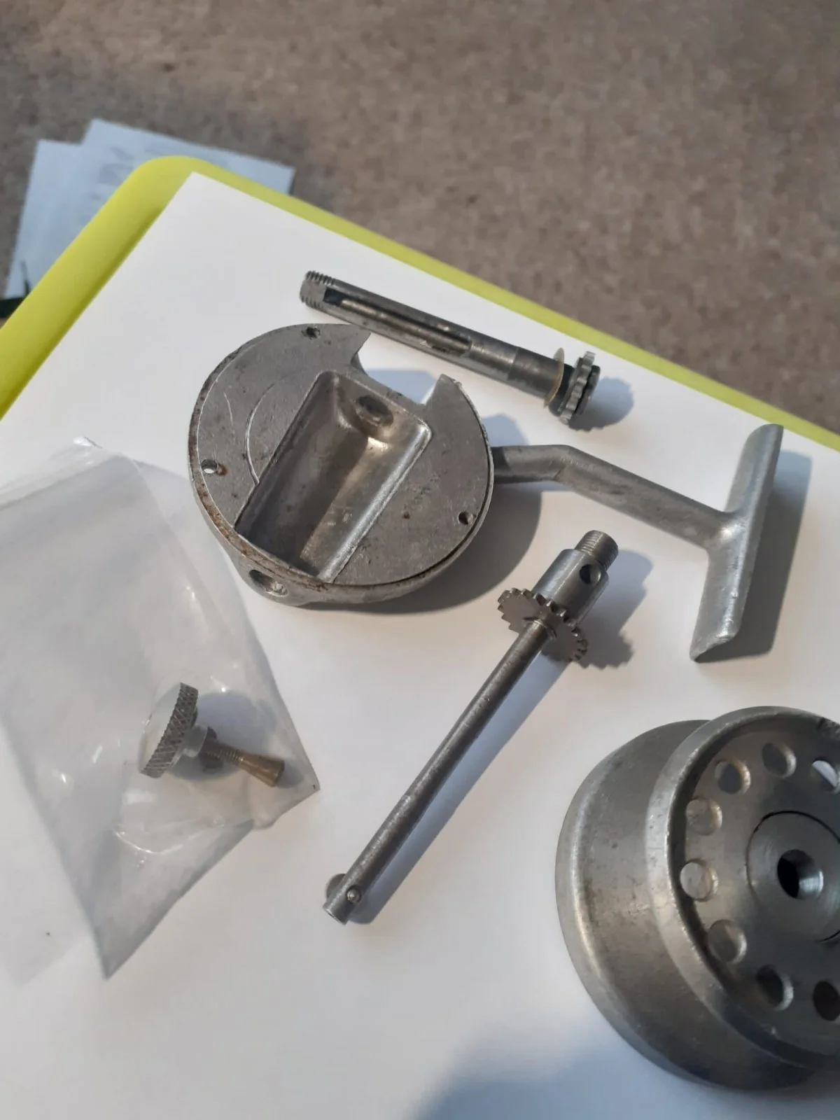 These are rare spare parts for a French made Louis Perrot #2 half bale reel circa 1948.It has an interesting mechanism within the spool rotor housing, whereby the bale arm opens automatically with a backwind turn of the handle. * Please note the parts shown do NOT make the complete reel. ( I think there are 2 or 3 small components missing)Perrot reels/spares are rarely listed for sale. An unusual French Reel.