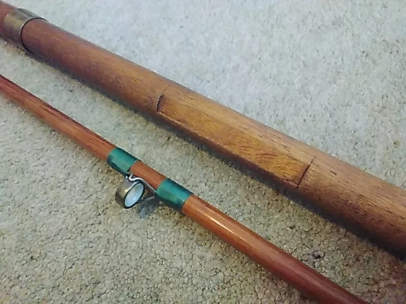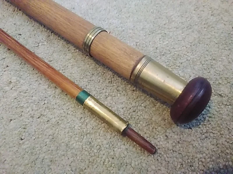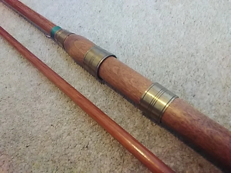 A lovely old wooden rod made in England way back. Over 100 years ago. 2 piece 8-1/2 ft. Hickory or Lancewood. Nicely refurbished.Has all the original top quality brass fittings and ceramic lined brass rings. Excellent. See pictures.