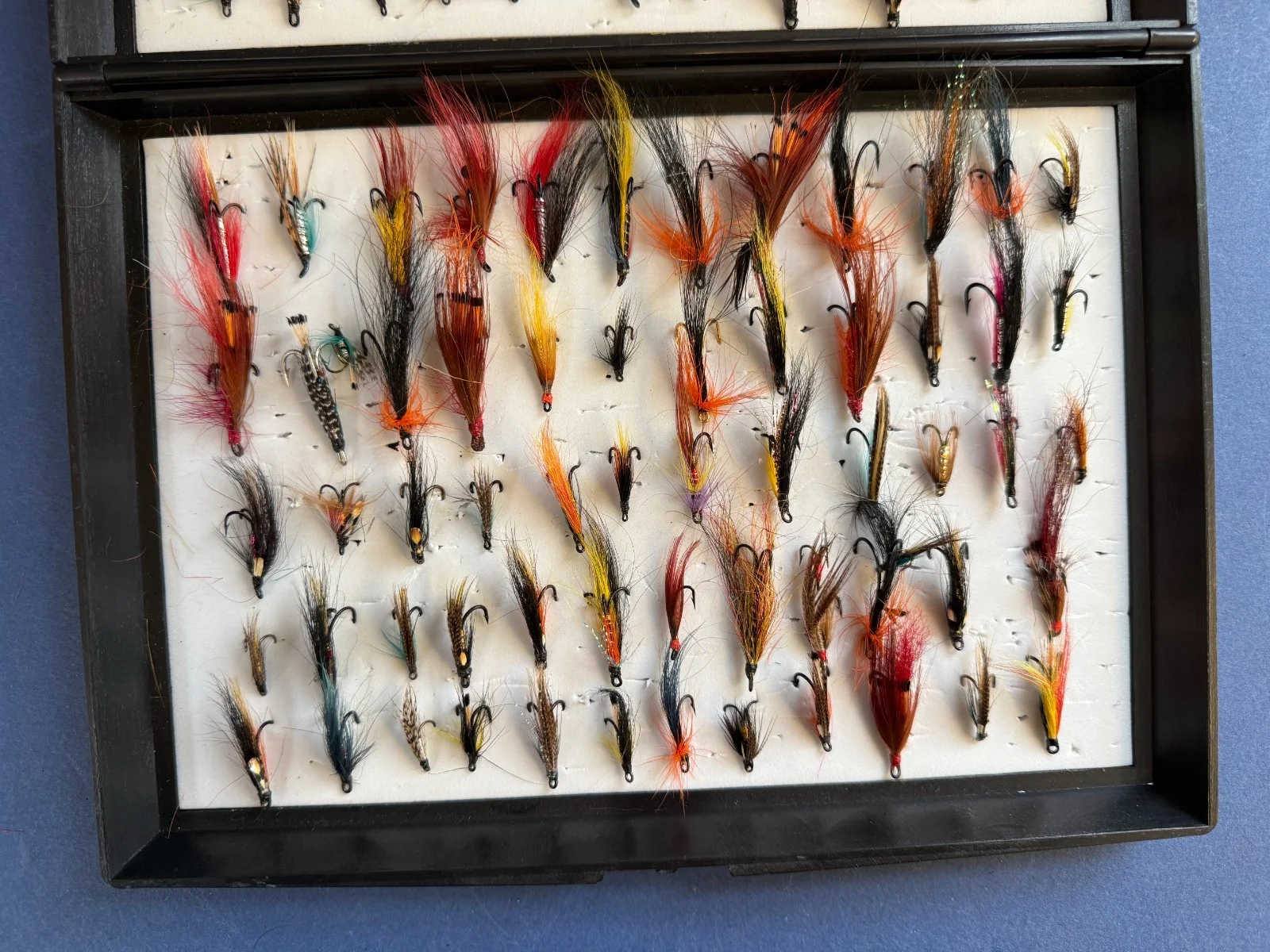 A LARGE FLY BOX / RESERVOIR10" X 7" WITH 120 DOUBLE AND TREBLE SALMON FLIES VARIOUS SIZES AND PATTERNSPLEASE SEE IMAGE